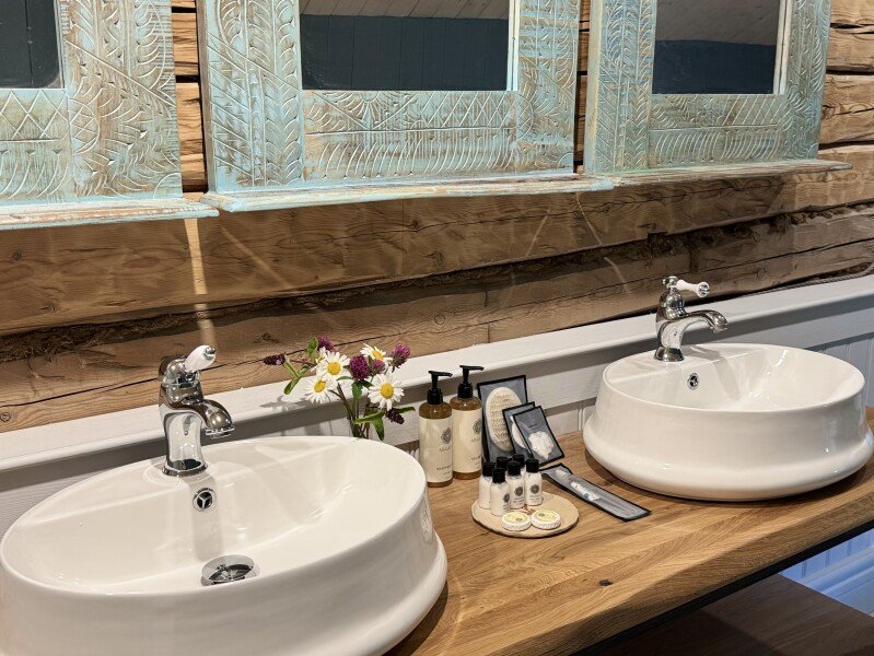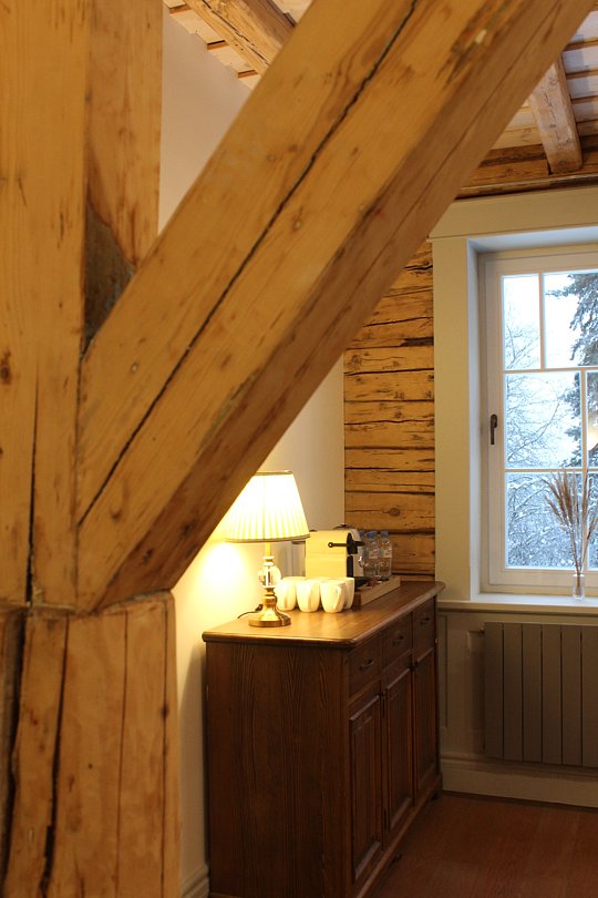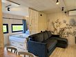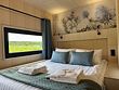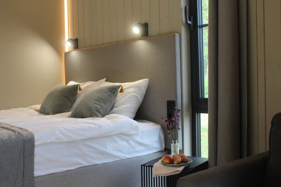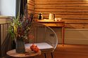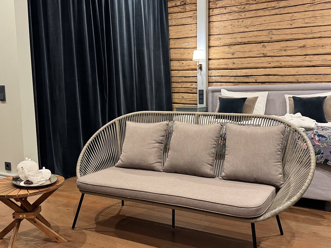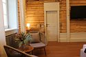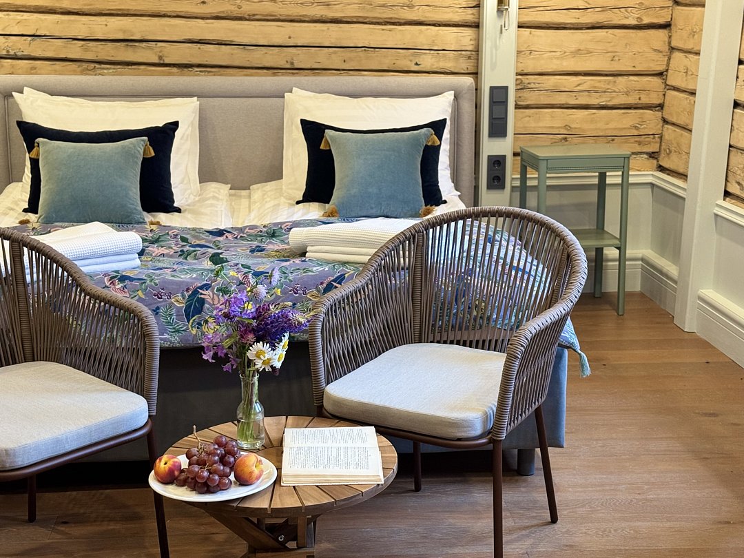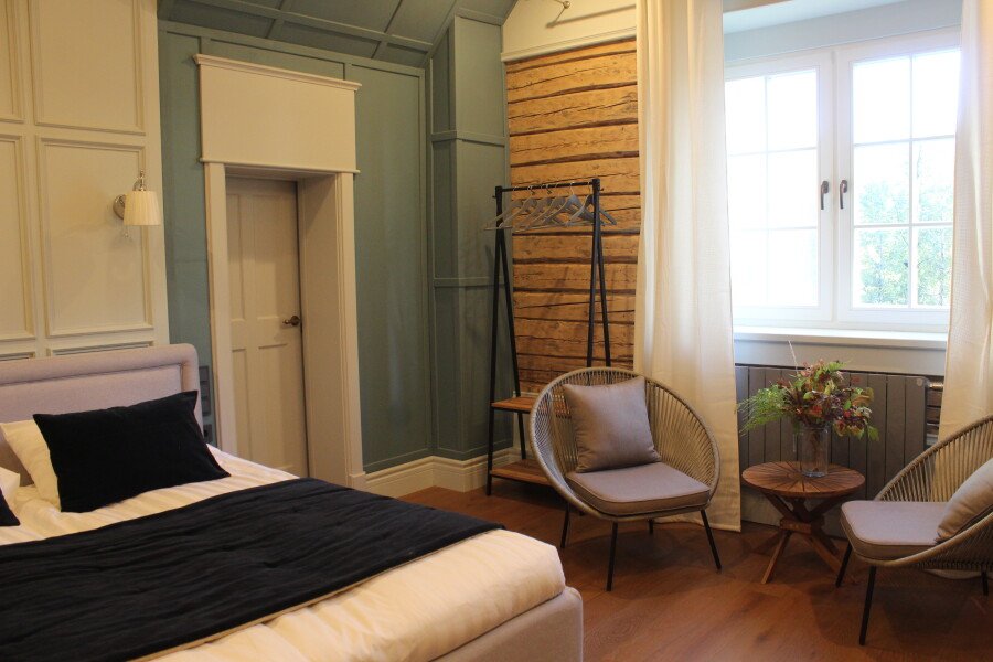 В номере также установлены два уютных кресла и столик. Интерьер комнаты выполнен из натуральных деревянных панелей с использованием элементов скандинавского декора. Из окон этого номера можно любоваться великолепными закатами.