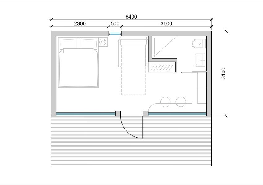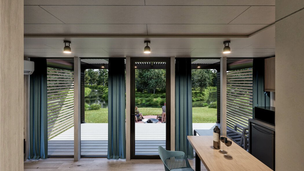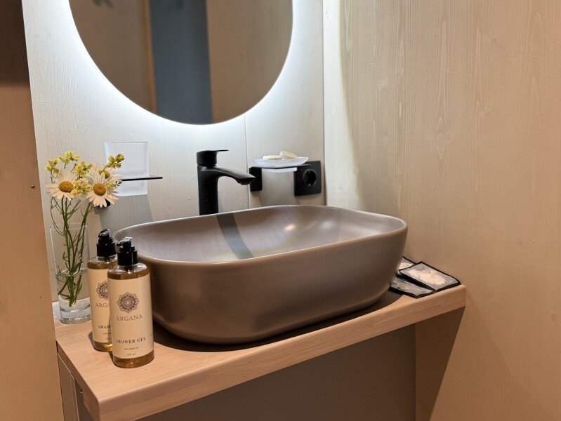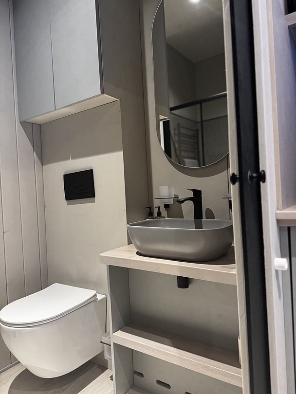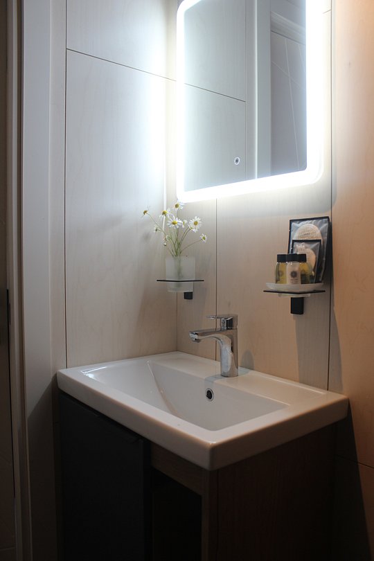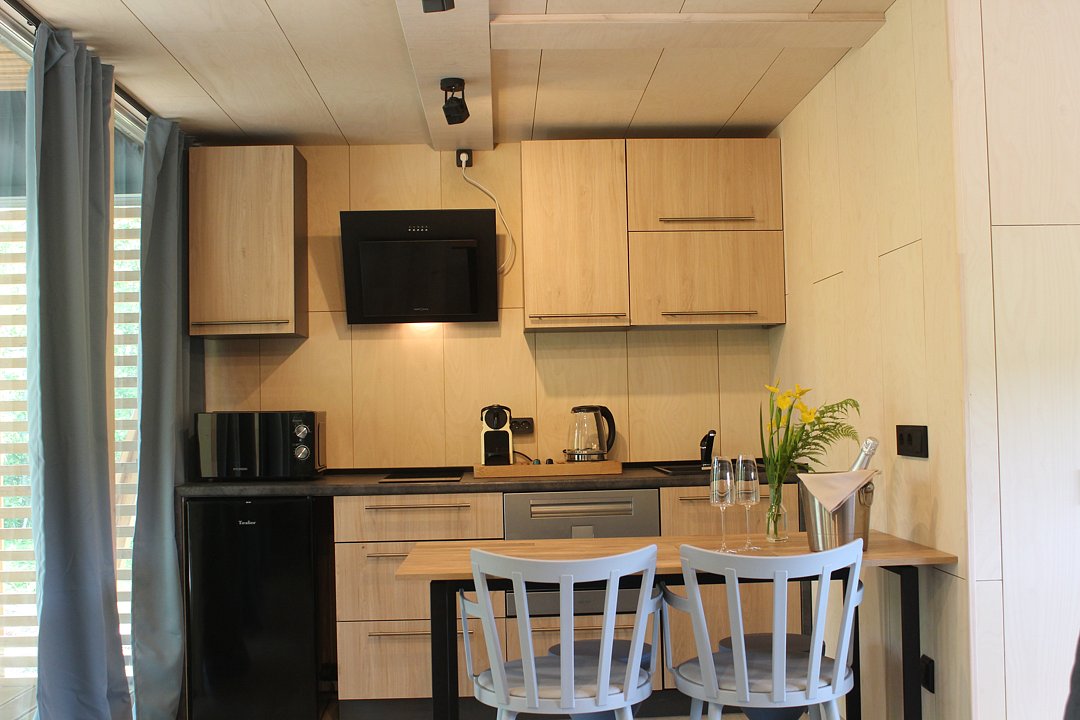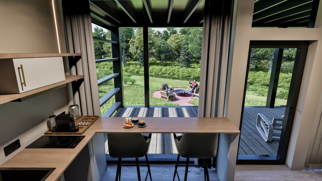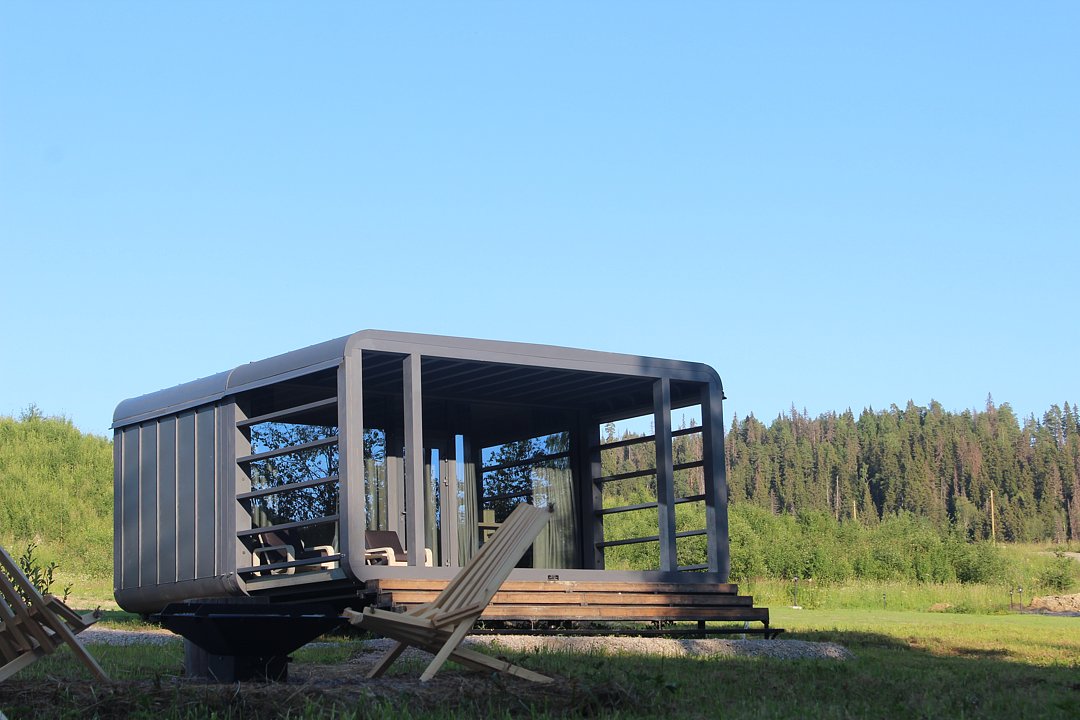 В домиках с террасой и панорамными окнами есть всё для комфортного проживания: удобные спальные места и свежее постельное белье, мини-кухня, оснащенная бытовой техникой и набором посуды, необходимыми для приготовления пищи, кондиционер и оборудованный санузел с душем и гигиеническими принадлежностями. Все дома отапливаются тёплыми полами и радиаторами. В каждом модуле работает высокоскоростной Wi-Fi.