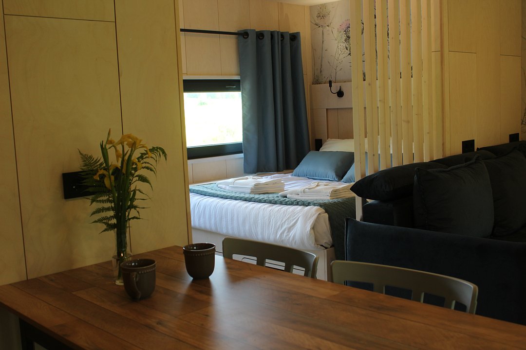 Небольшие домики (22 кв. м.) со всем необходимым для комфортной жизни двух или трёх взрослых или семьи с одним ребёнком. Панорамное окно с видом на речку и собственная терраса с мангальной зоной. Полностью оборудованная кухня и стабильный Wi-fi сделают ваше проживание комфортным и уютным.