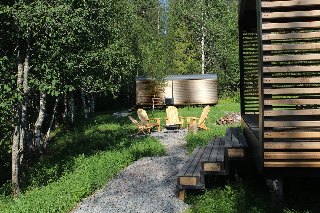 Глэмпинг находится на берегу живописной тихой реки Тохмайоки, в которой водятся щука и караси, и иногда даже форель.