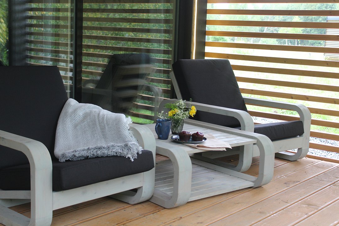 Для вашего комфортного отдыха на веранде эко-модуля расположены удобные кресла, столик и специальные мангалы. Гостям предлагаются также наборы для готовки.