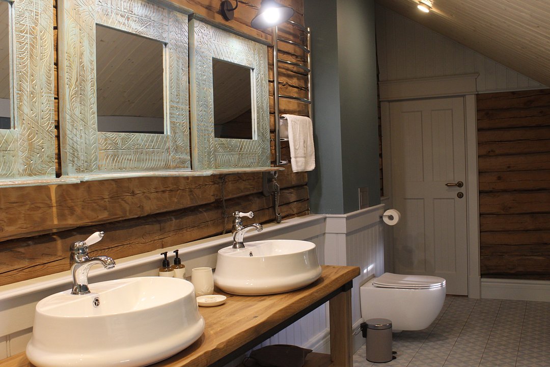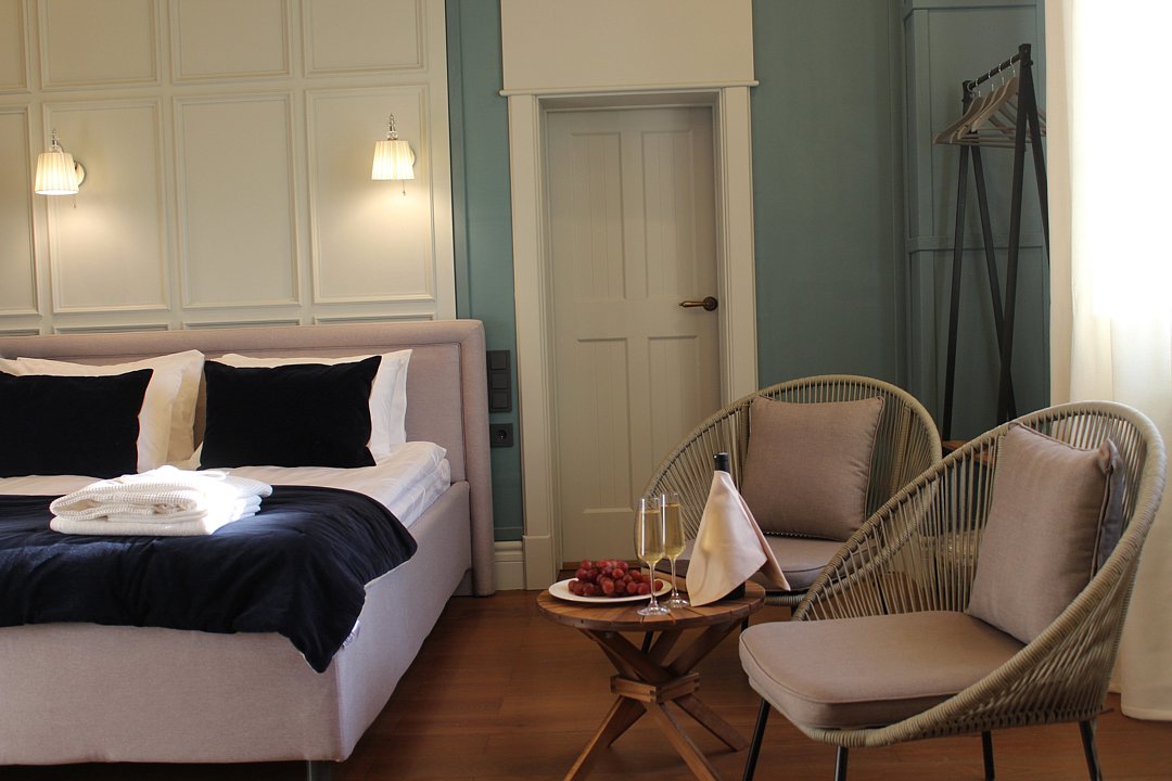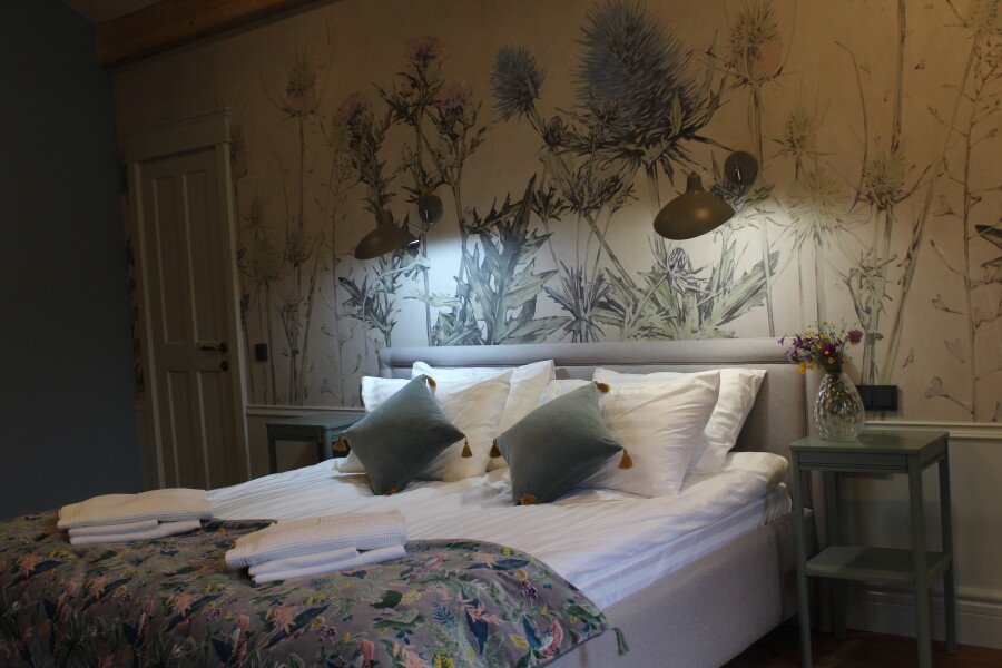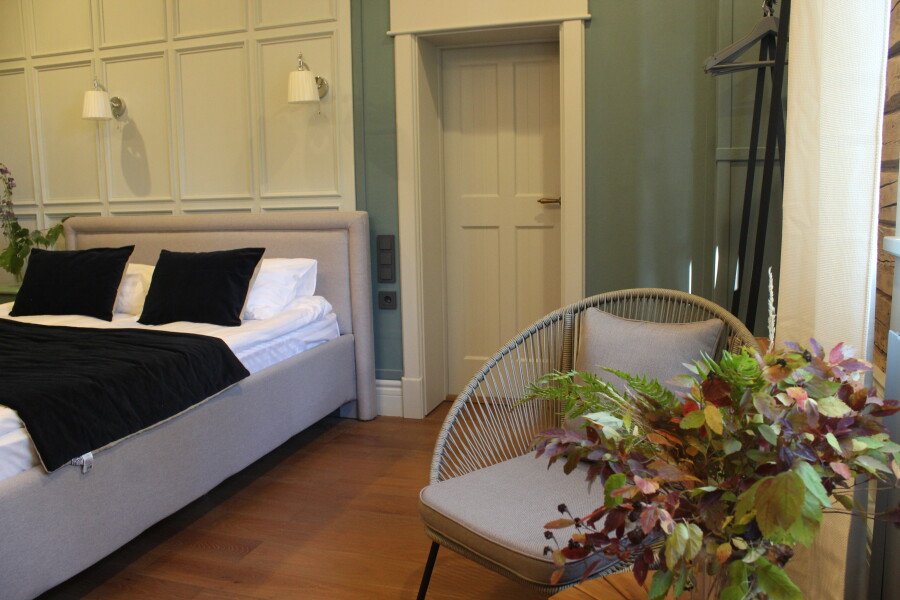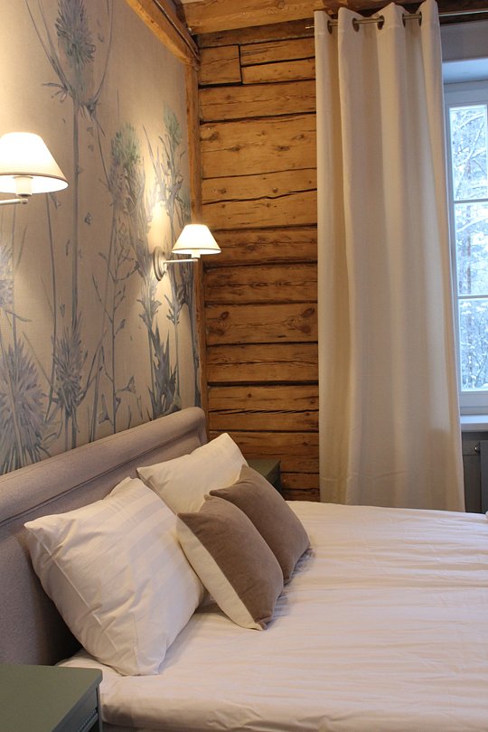 В комнате площадью 20 кв. м расположена кровать с ортопедическим матрасом 160х200 см и удобное рабочее место у широкого окна с видом на вековой лес. В правом крыле номера устроена огромная ванная комната площадью 11 кв. м, на противоположной стороне – оригинальная детская спальня-игровая и гардероб.