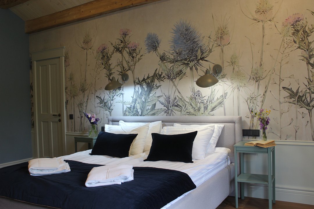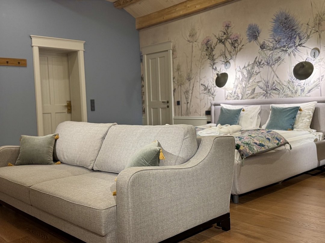 Четырёхместный номер на втором этаже коттеджа. В комнате расположена кровать размера king-size с ортопедическим матрасом 180х220 см, раскладной диван 160х200 см, телевизор, два уютных кресла, журнальный столик и удобное рабочее место. Просторная гардеробная в отдельном помещении.