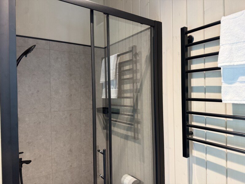 Домики с увеличенной площадью (38 кв. м.) со всем необходимым для комфортной жизни до четырех взрослых или семьи с детьми. Панорамное окно с видом на речку и собственная терраса с мангальной зоной. Спальная и гостиная зоны разделены. Полностью оборудованная кухня и стабильный Wi-fi сделают ваше проживание комфортным и уютным.