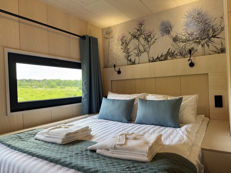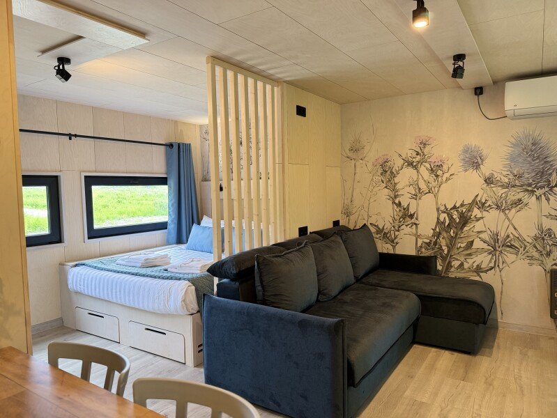 Одна двуспальная кровать, одна диван-кроватьВ глэмпинге