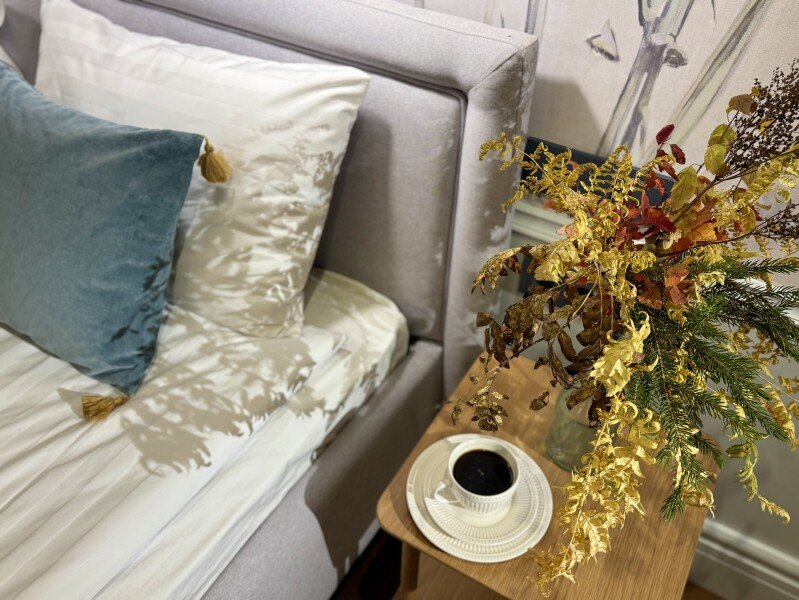 В каждой спальне есть двуспальная кровать с ортопедическим матрасом 160х200 см, рабочее место и просторный шкаф-купе для одежды.