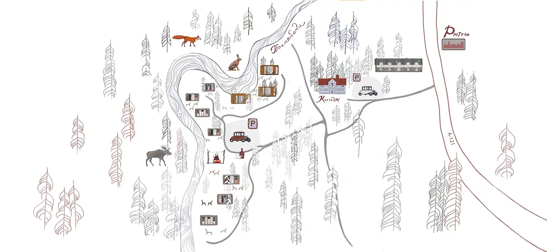 Территория отеля начинается сразу после съезда с федеральной трассы. После того как повернете и проедете мимо зданий Старой усадьбы первый поворот направо к зданию Коттеджа в Лесу, Рюттю 31, прямо и чуть правее здания Эко Вилладж Someroya на берегу реки Тохмайоки.