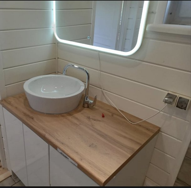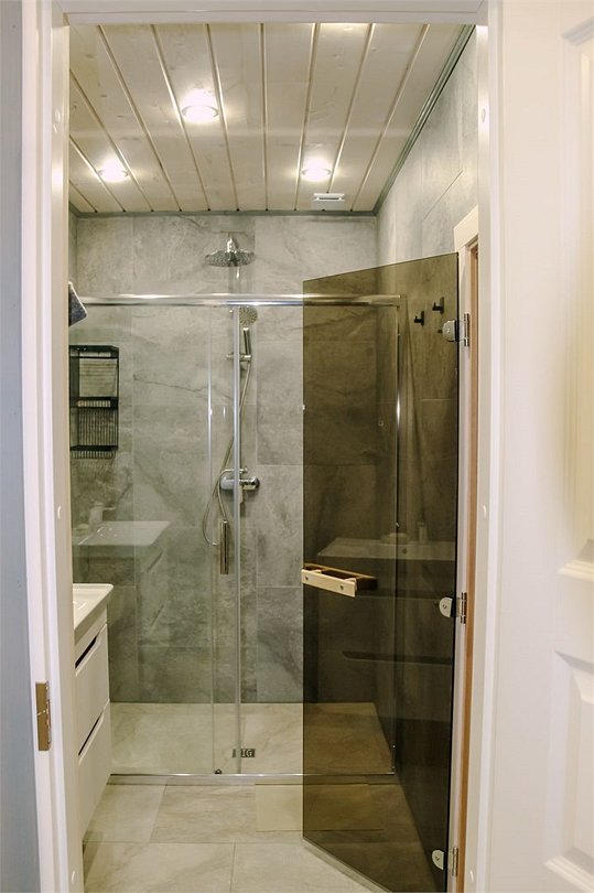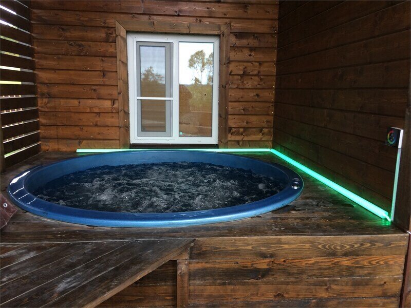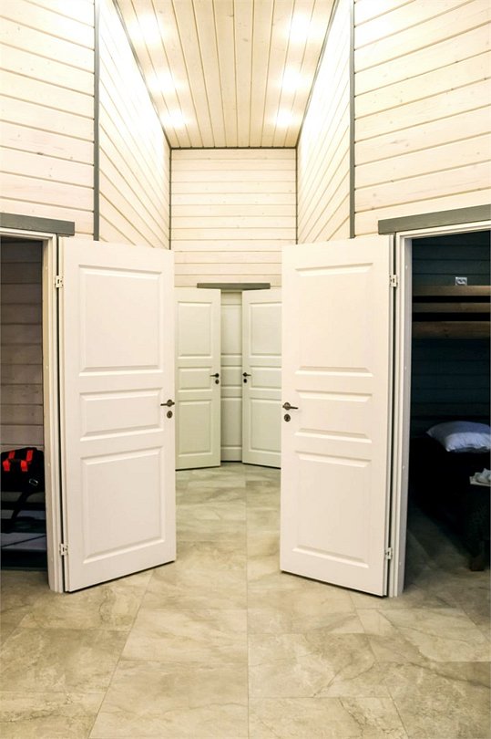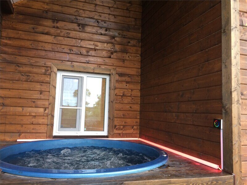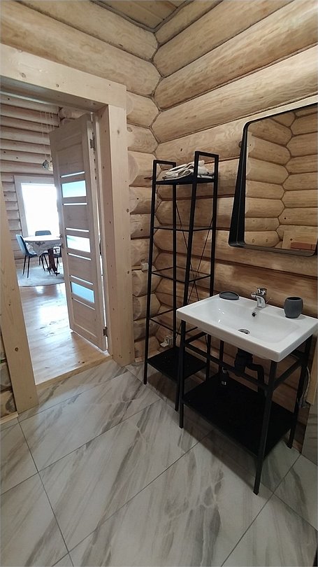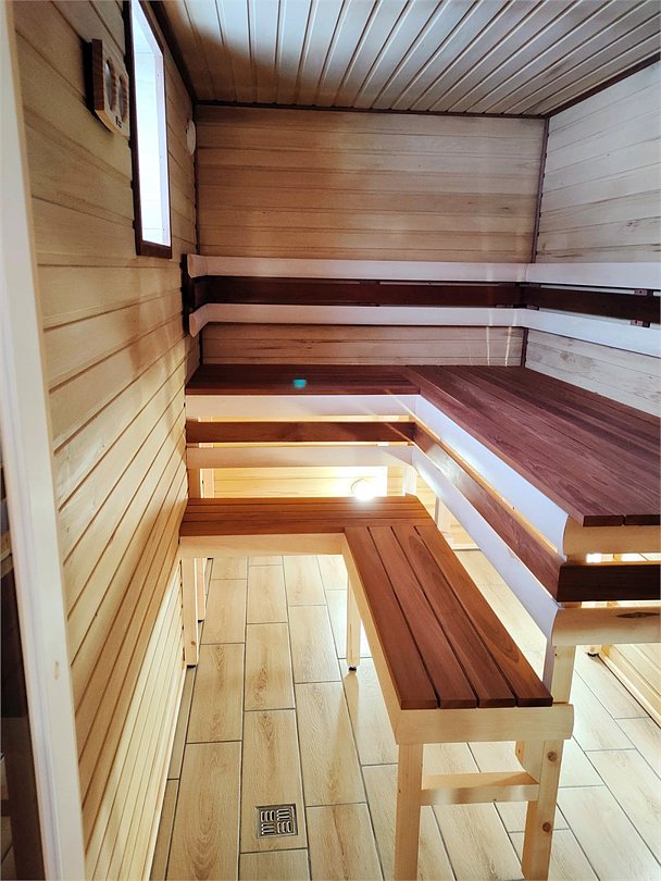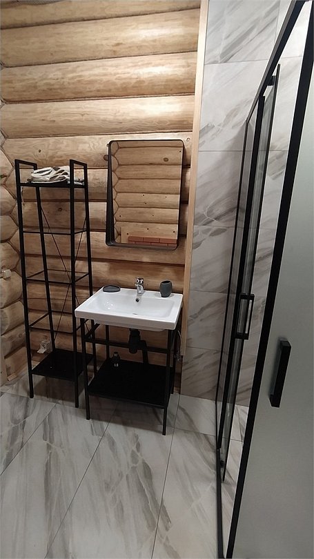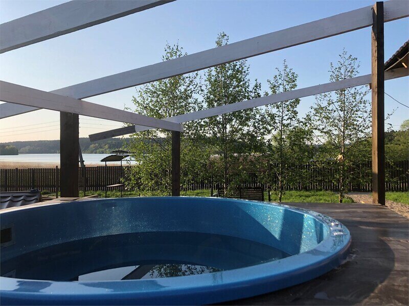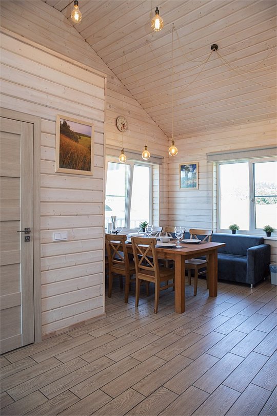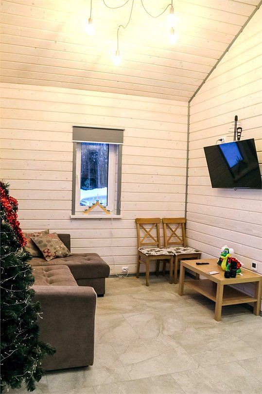Теплые полы расслабляют после прогулок по лесу, горячая сауна согревает холодными вечерами, прозрачная купель поможет улучшить качество отдыха.