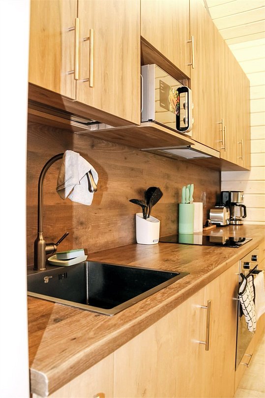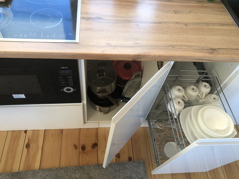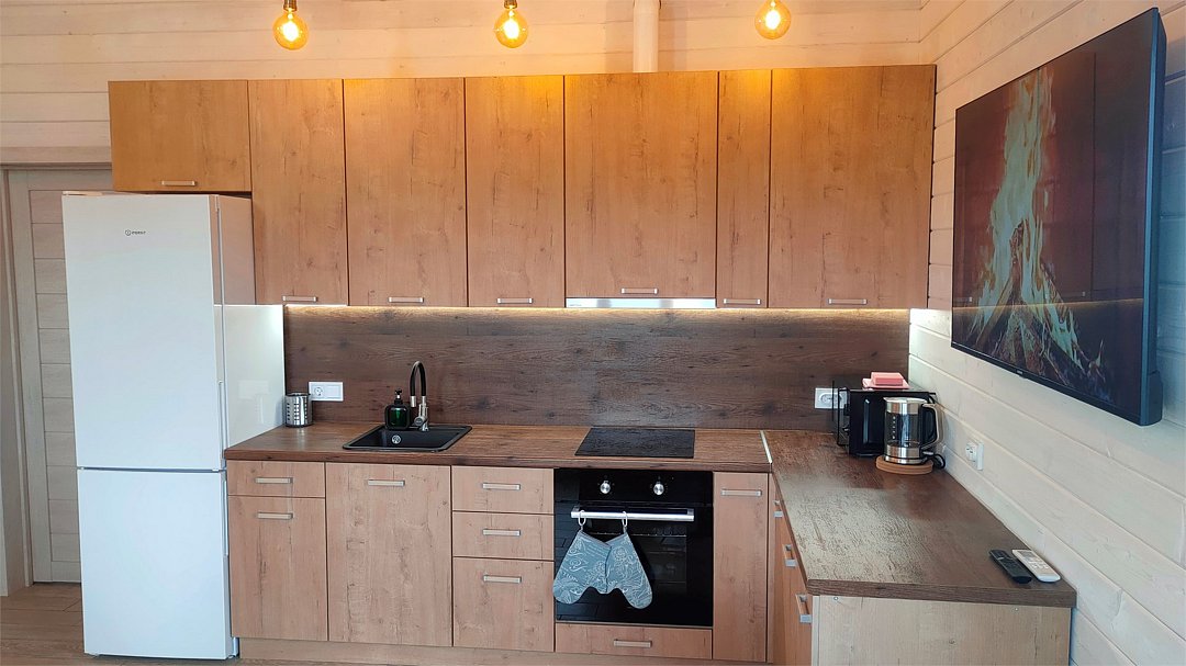 В доме есть спальня, гостиная, кухня полностью оборудована бытовой техникой ( холодильник, чайник, кофеварка, тостер, плита, СВЧ печь. Утюга нет.