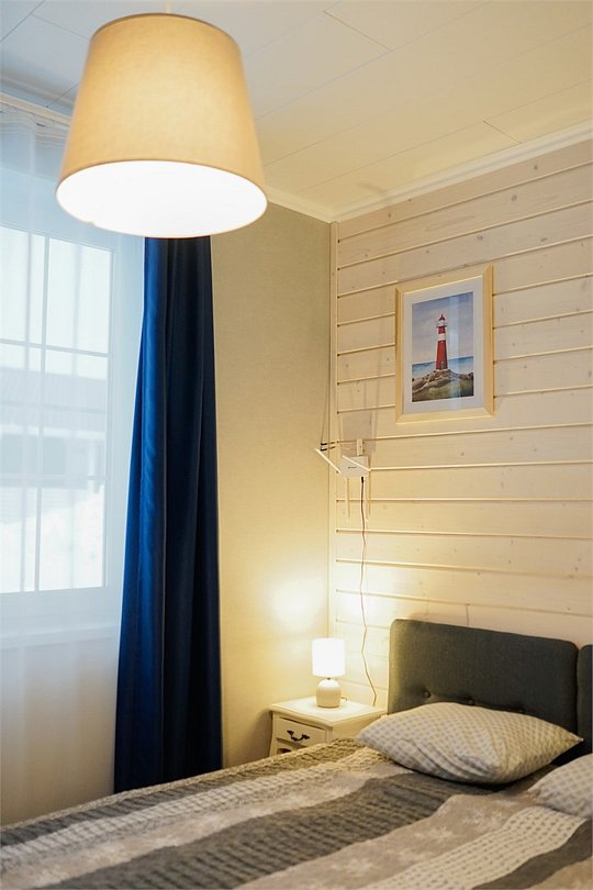 Спальня на втором этаже — двуспальная кровать и односпальное кресло-кровать Икеа.