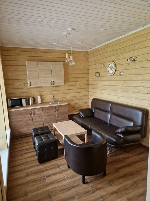 В коттедже имеется 2 комнаты: спальня и гостиная зона с кухней. Кухня оснащена всей необходимой техникой и посудой для самостоятельного приготовления блюд. Есть все необходимые аксессуары: фен, постельное белье, набор полотенец, одноразовые тапочки, косметическая продукция.