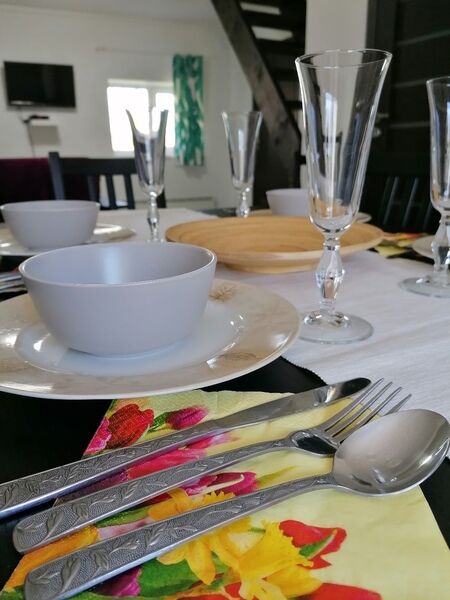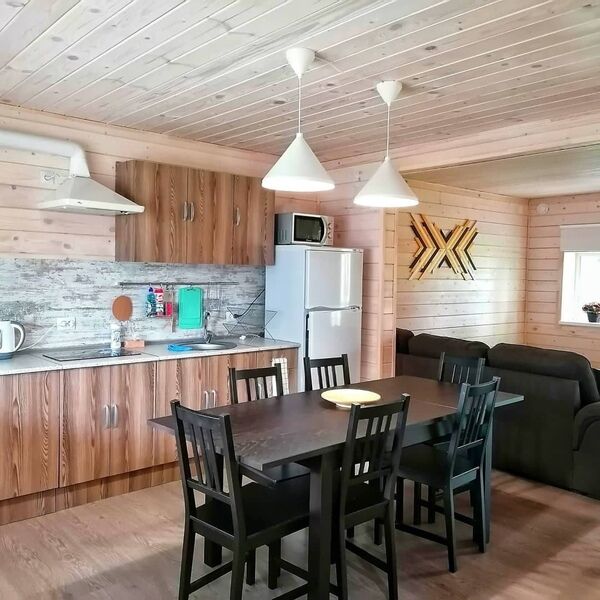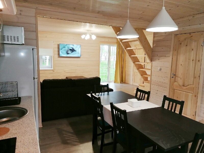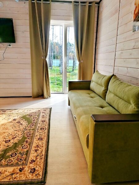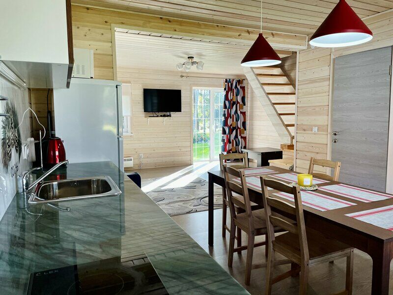 Просторная гостиная и кухня с необходимым оборудованием для приготовления и хранения продуктов, кухонная утварь, обеденный стол и стулья. Диван-кровать (1-2 чел), телевизор с плоским экраном. Санузел и душ.