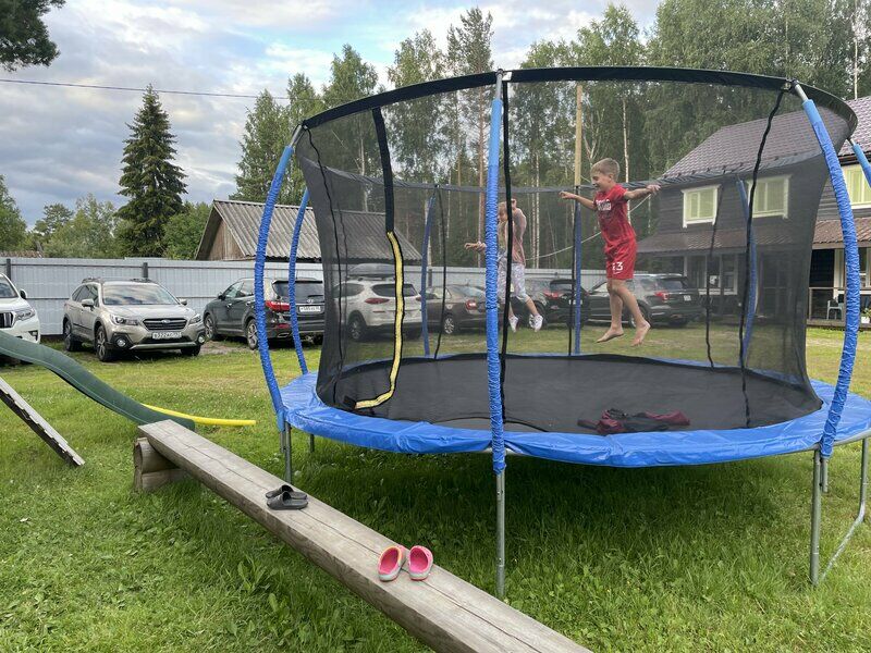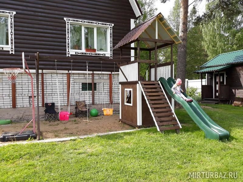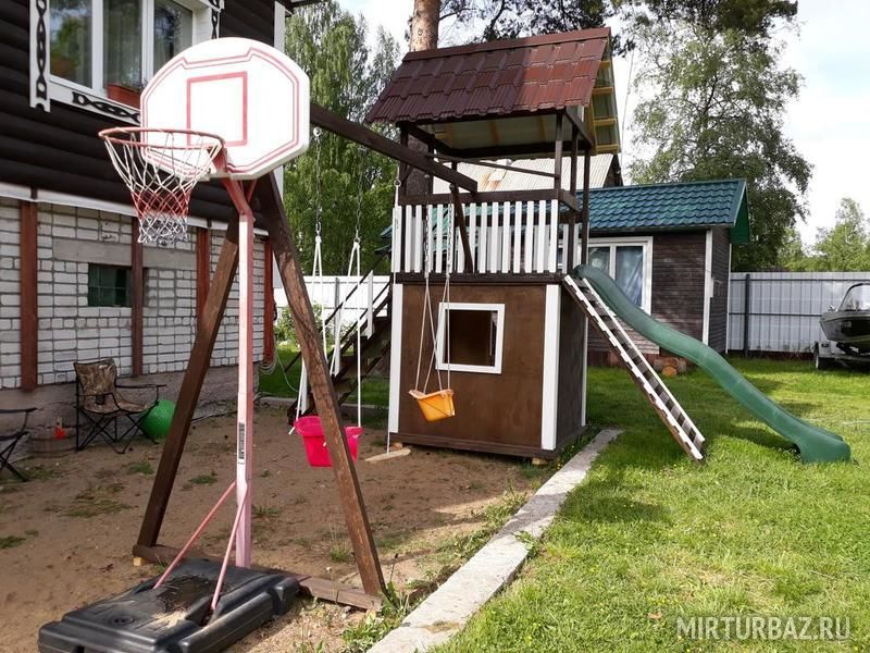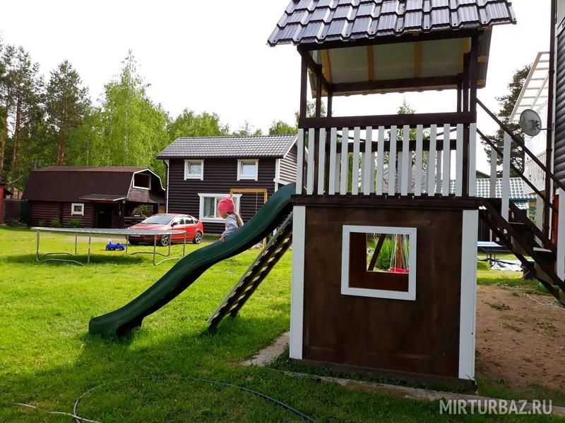 Игровой домик с горкой для детей до 5 лет, большой батут с защитной сеткой, песочница, качели, бадминтон и пр. игровые принадлежности.