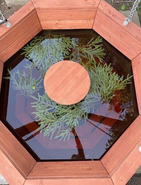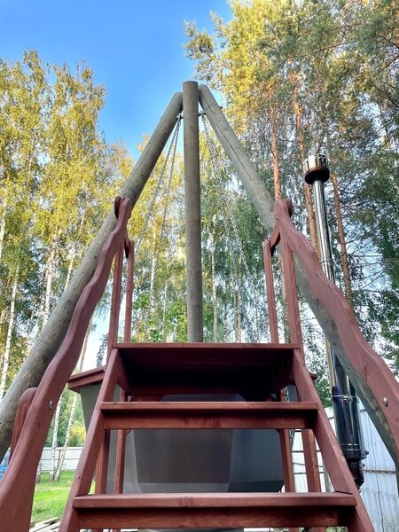 Подвесной сибирский банный чан для парения на свежем воздухе, отделан деревом из алтайского кедра, к нему приставлена лесенка из того же ценного дерева. Чан из нержавейки с печью на водяной рубашке, что позволяет нагреть его снизу верх до температуры парения значительно быстрее.