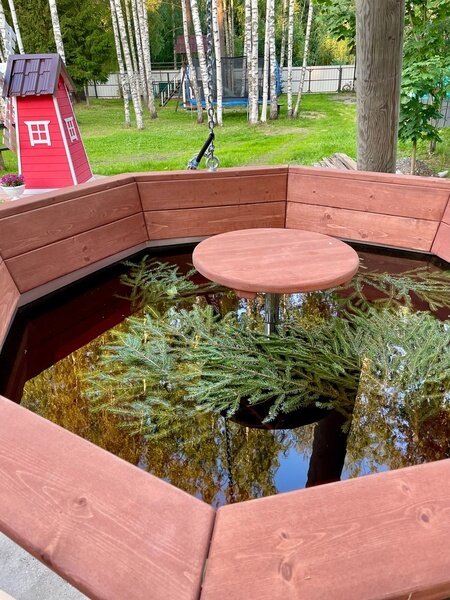 С комфортом вмещает до 8 человек. Для удобства его оснастили плавающим столиком и подсветкой воды для особого эффекта. В день возможно два сеанса от 3 часов (баня + чан).
