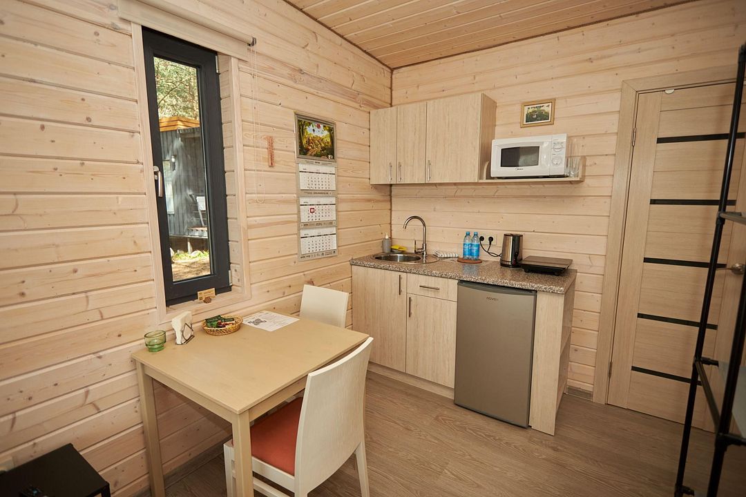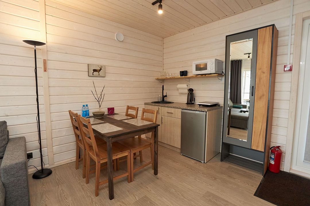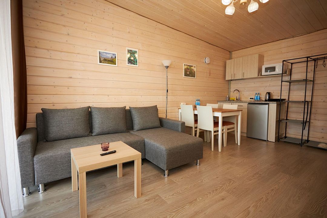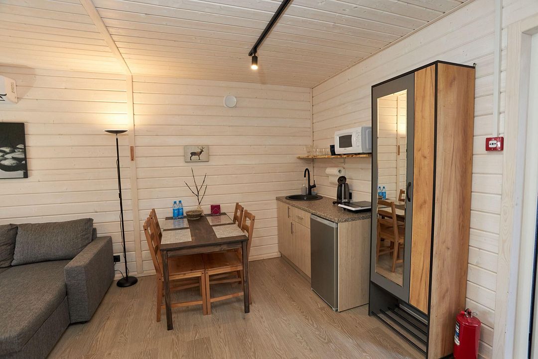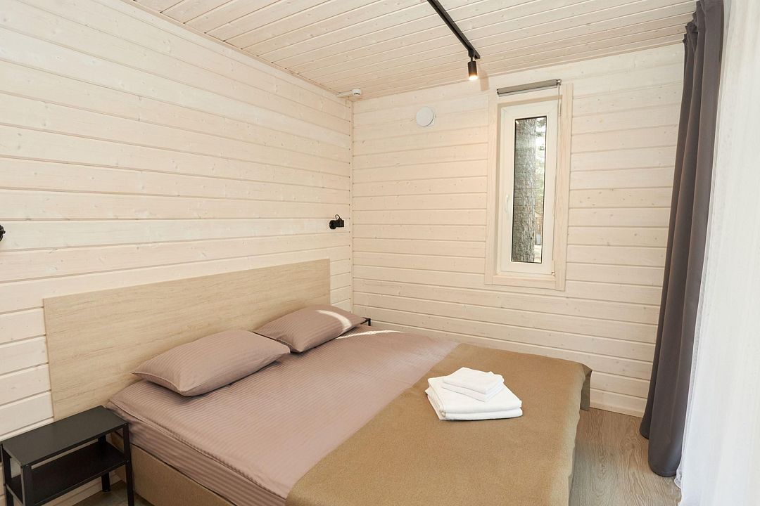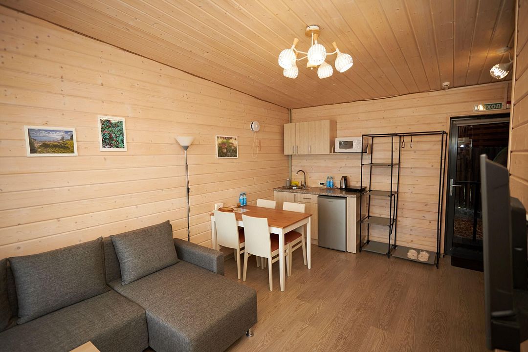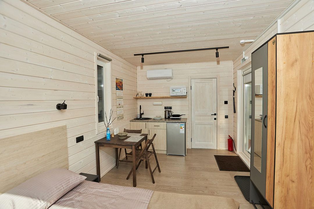 В каждом домике есть спальня с двухместной кроватью (с возможностью разделения спальных мест); гостиная с диваном, на котором возможно разместить еще до двух гостей, за доплату; кухня со всем необходимым (холодильник, чайник, плита с одной конфоркой, микроволновка, посуда для приготовления и приема пищи); санузел с горячим душем и туалетом; небольшая электрическая сауна, нагревается до 60–70°C; Smart TV и WiFi; кондиционер.