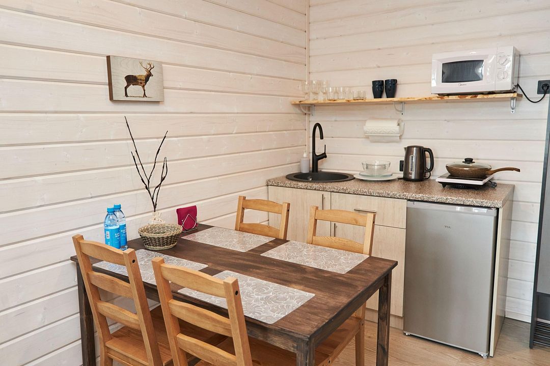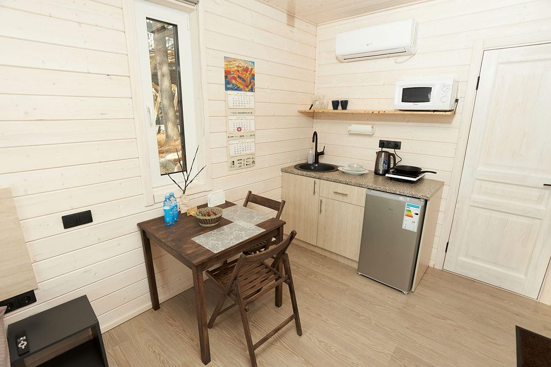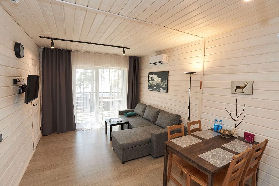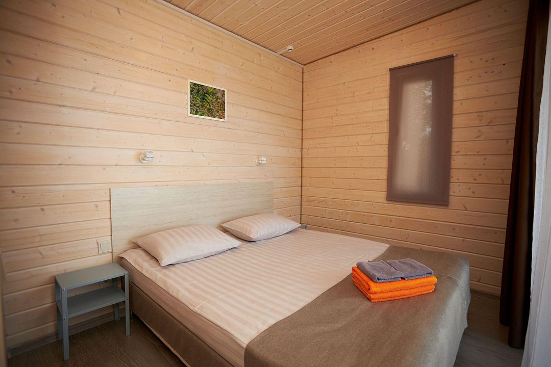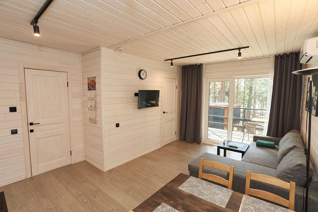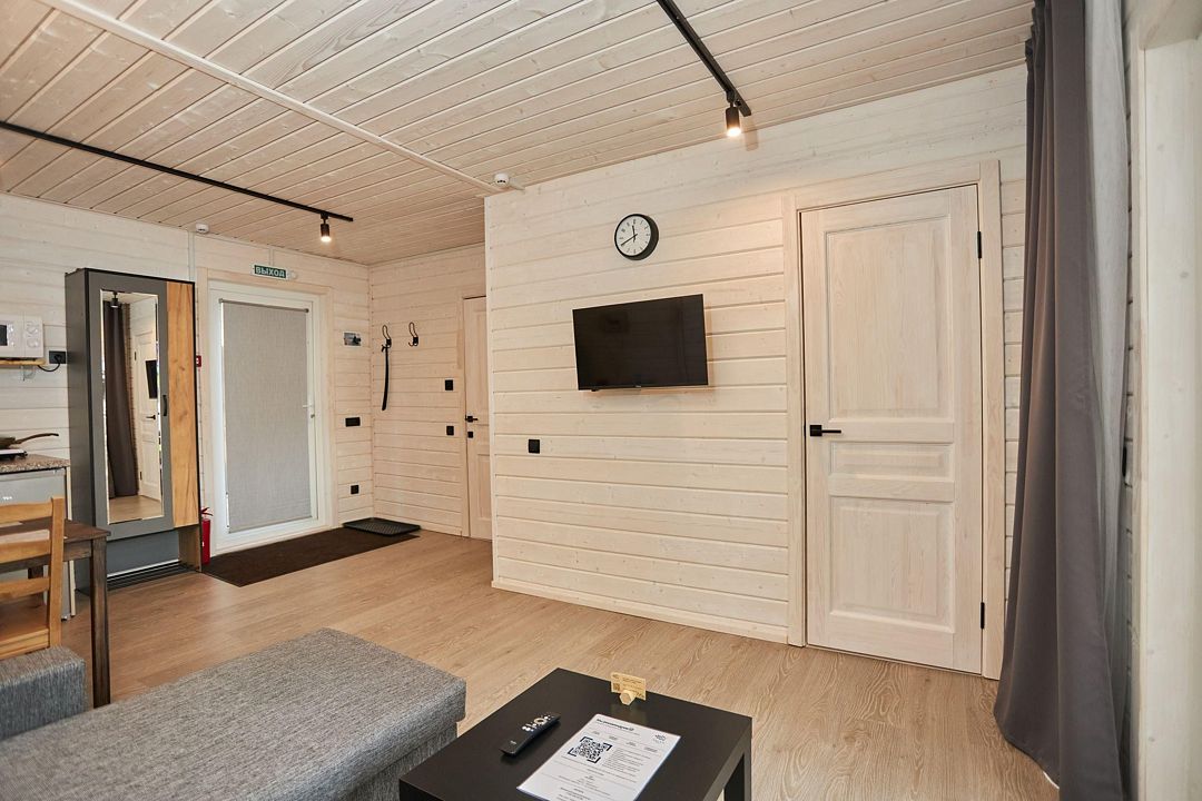 В каждом домике есть спальня с двухместной кроватью (с возможностью разделения спальных мест); гостиная с диваном, на котором возможно разместить еще до двух гостей, за доплату; кухня со всем необходимым (холодильник, чайник, плита с одной конфоркой, микроволновка, посуда для приготовления и приема пищи); санузел с горячим душем и туалетом; небольшая электрическая сауна, нагревается до 60–70°C; Smart TV и WiFi; кондиционер.