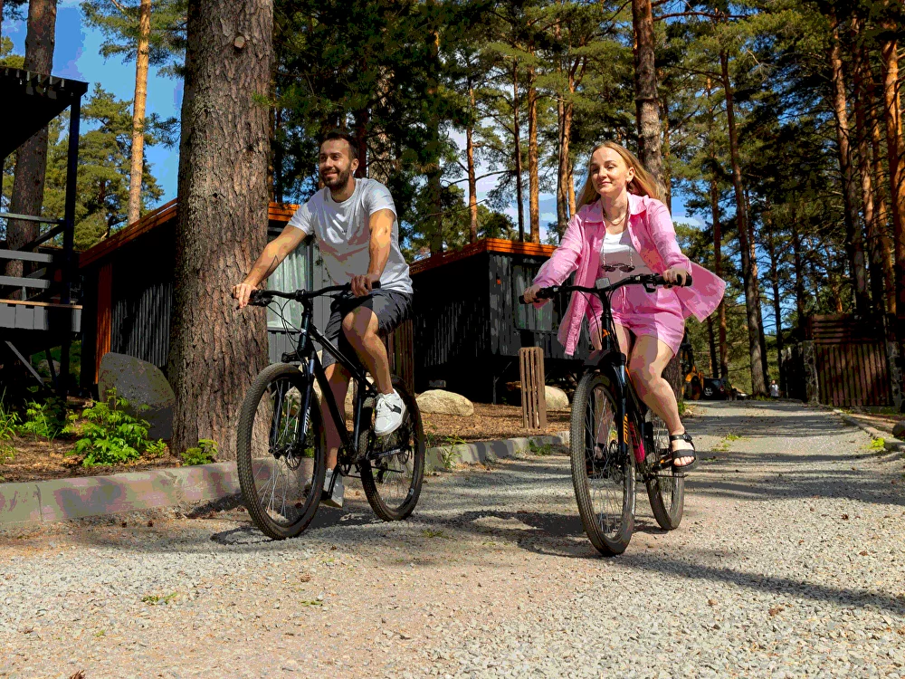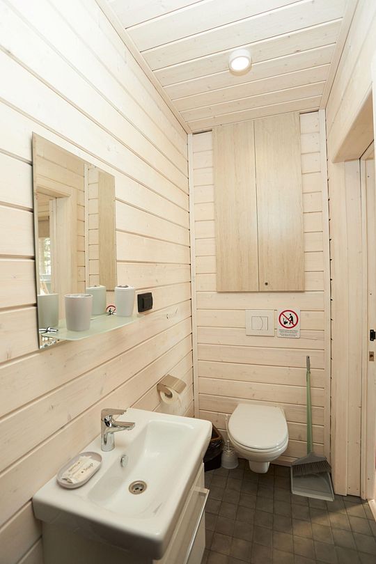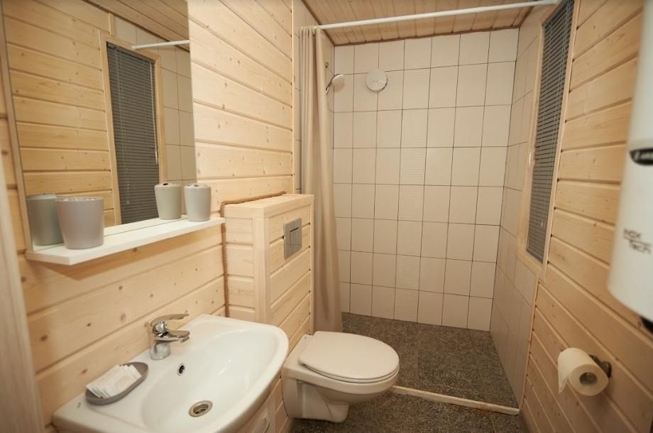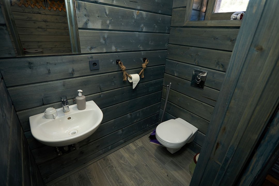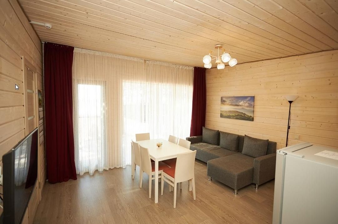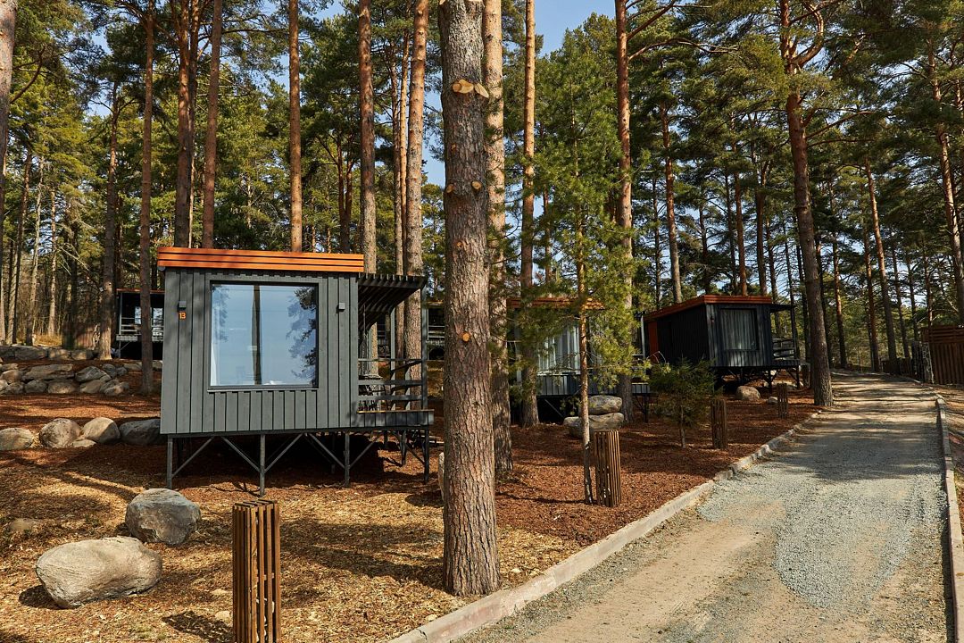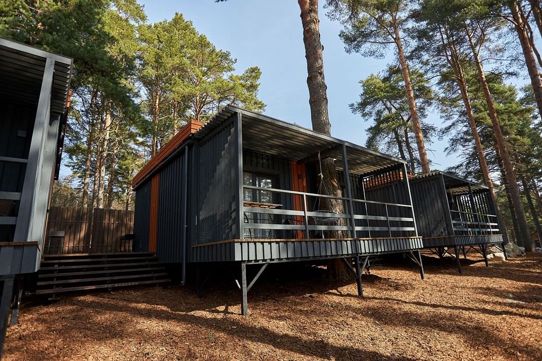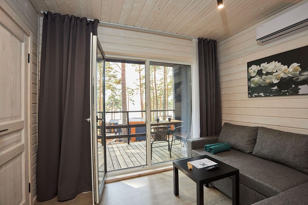 В каждом домике есть спальня с двухместной кроватью (с возможностью разделения спальных мест); гостиная с диваном, на котором возможно разместить еще до двух гостей, за доплату; кухня со всем необходимым (холодильник, чайник, плита с одной конфоркой, микроволновка, посуда для приготовления и приема пищи); санузел с горячим душем и туалетом; небольшая электрическая сауна, нагревается до 60–70°C; Smart TV и WiFi; кондиционер.