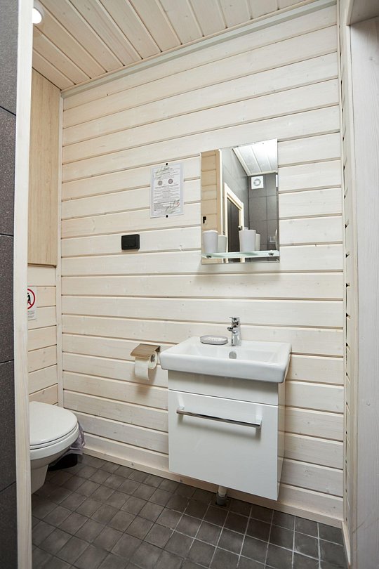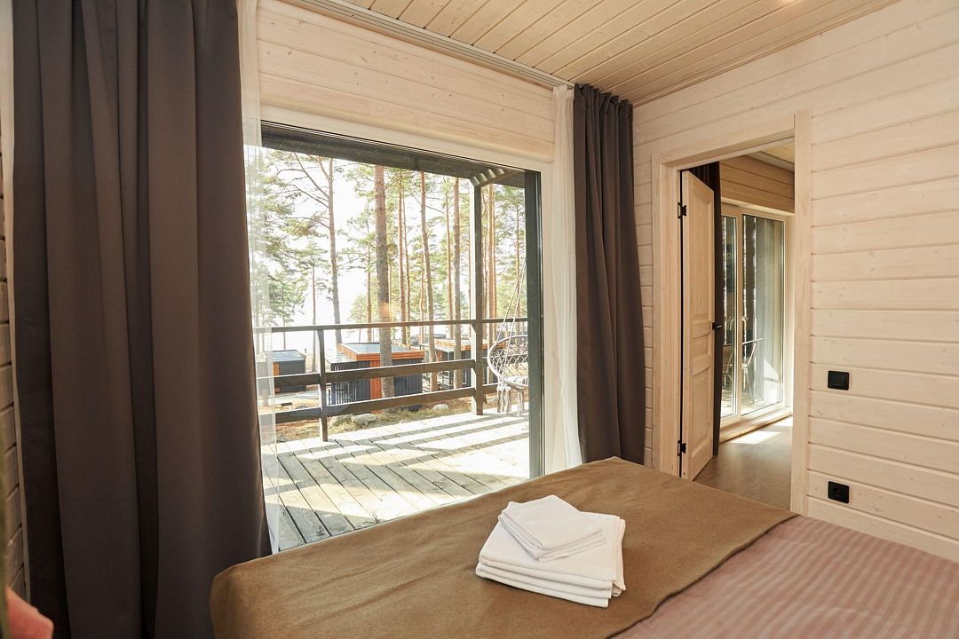 Комфортный дом категории «Комфорт с сауной» 32 м², с видом на Онежское озеро. Домики на второй береговой линии, до 200 метров от берега, рядом с рестораном.