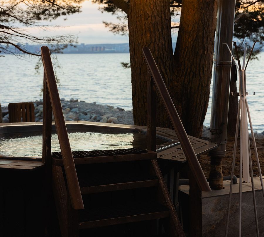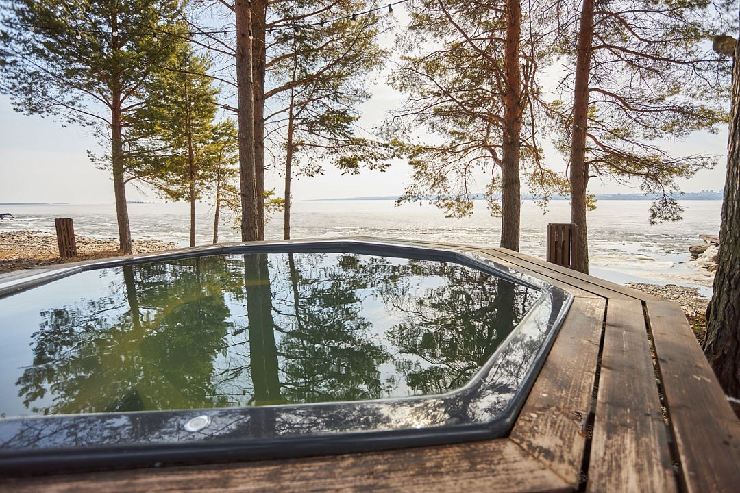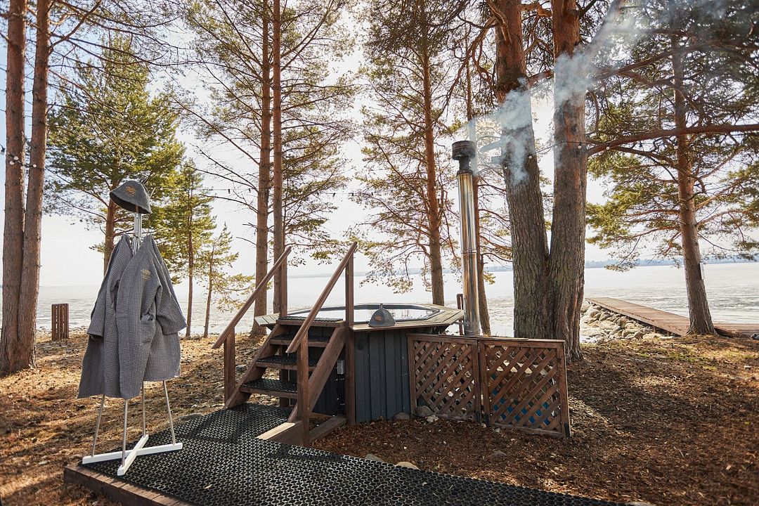 На берегу Онежского озера, рядом с баней, находится купель, в которой могут разместиться до шести человек. Вода в ней подогревается, что создает идеальные условия для отдыха на природе.