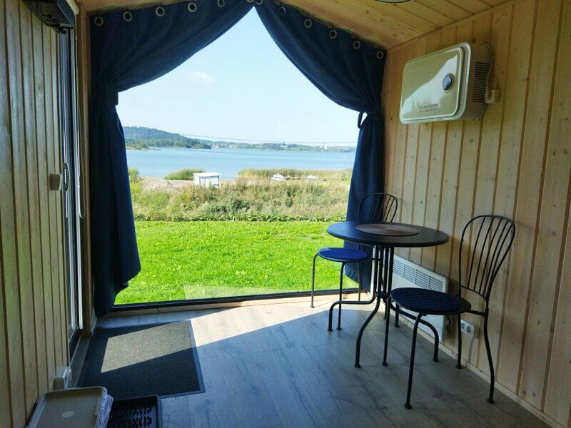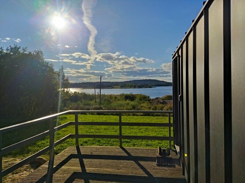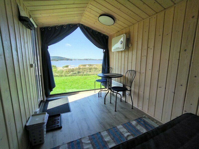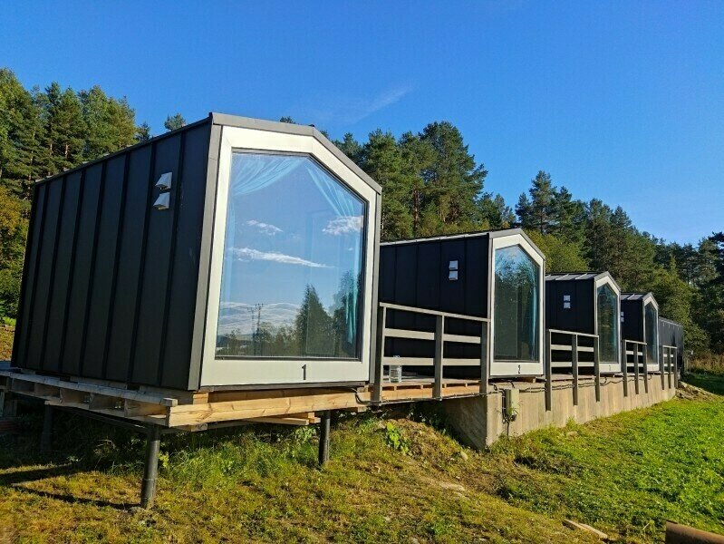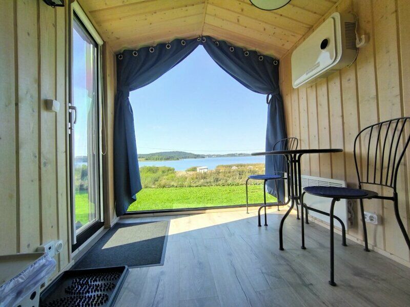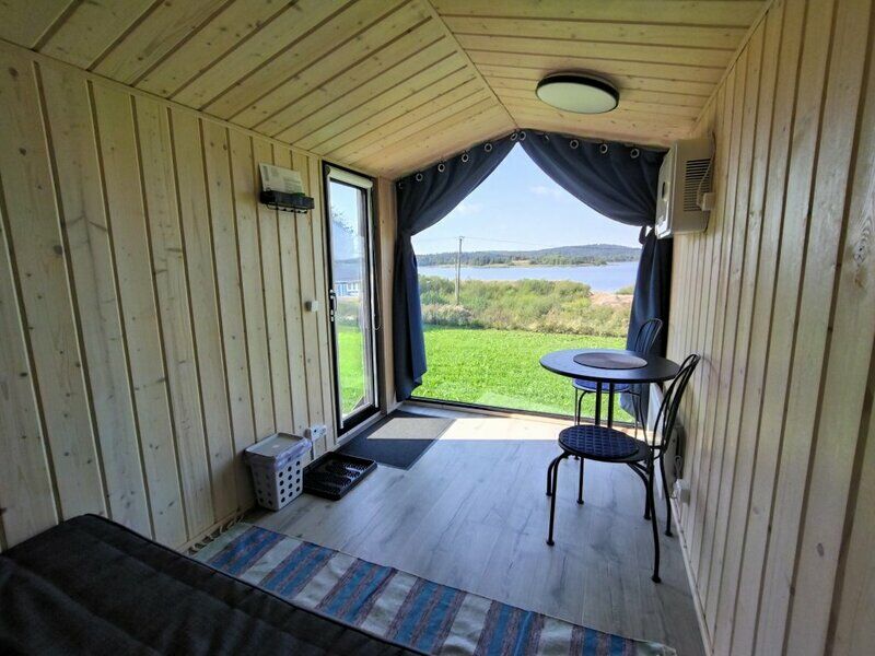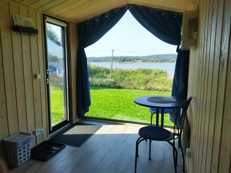 Однокомнатный домик с видом на озеро и панорамным остеклением отлично подойдет для парного кратковременного отдыха на природе. Два основных места.