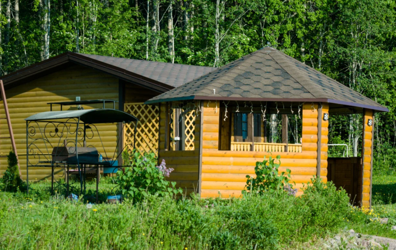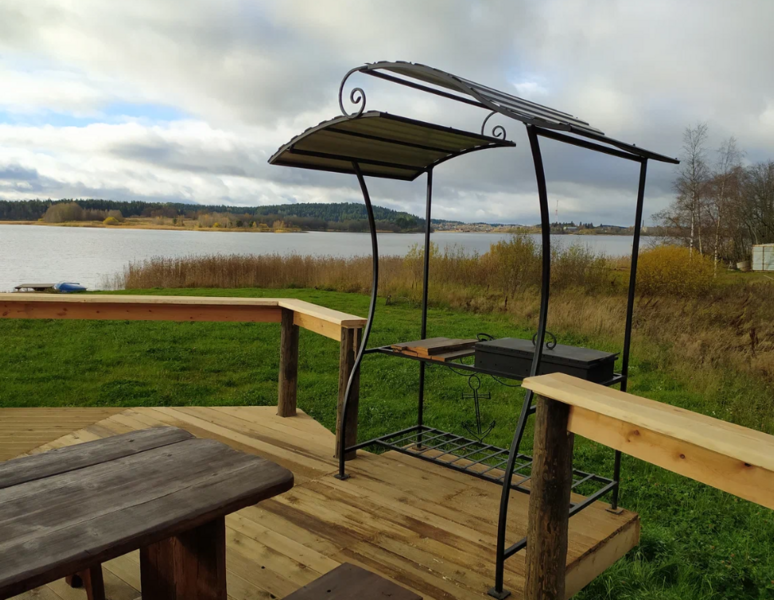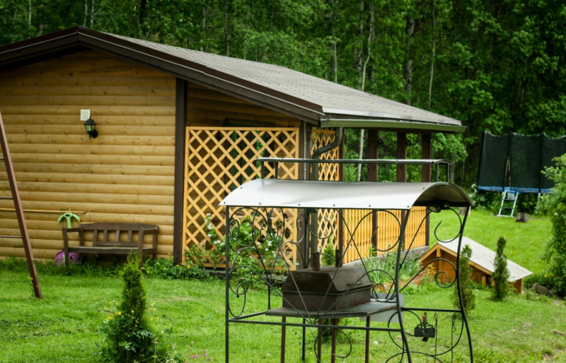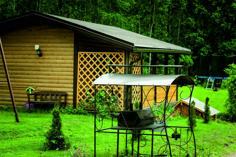 Дом оборудован беседкой и мангалом с навесом и принадлежностями.