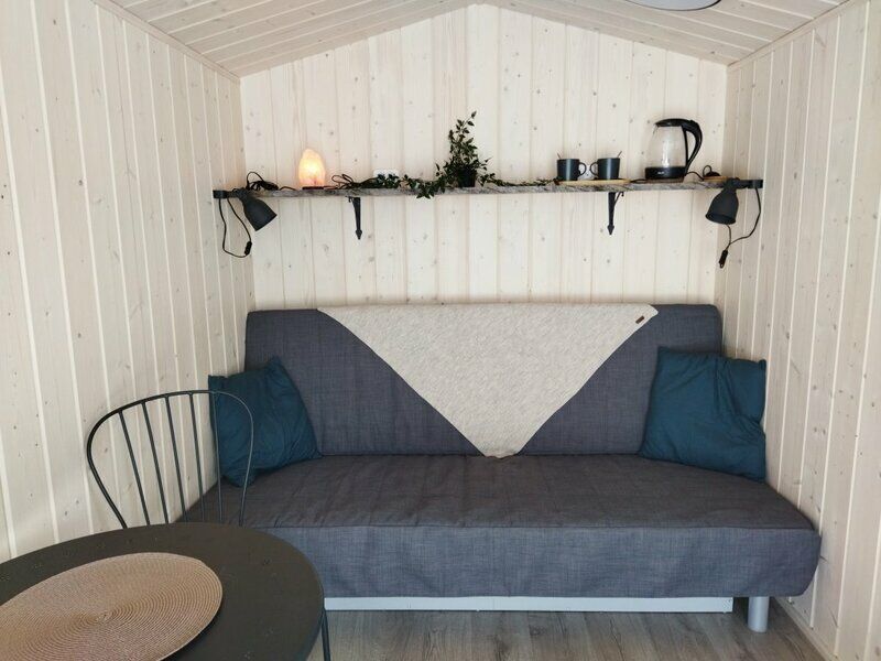 8 кв.м.2-спальный диван-кровать, электрический чайник, санитарный узел с душевой и горячей водой находится в отдельном блоке.