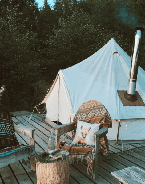 Небольшой романтичный шатер на двоих с гамаком и террасой. В шатре отсутствует электричество, отопление только дровяной печью. Атмосфера полного единения с природой. Кровать king size. Максимальная вместимость 2 человека.