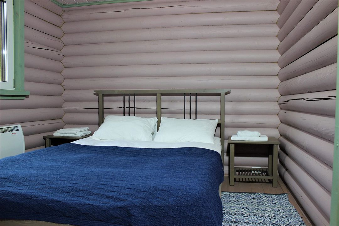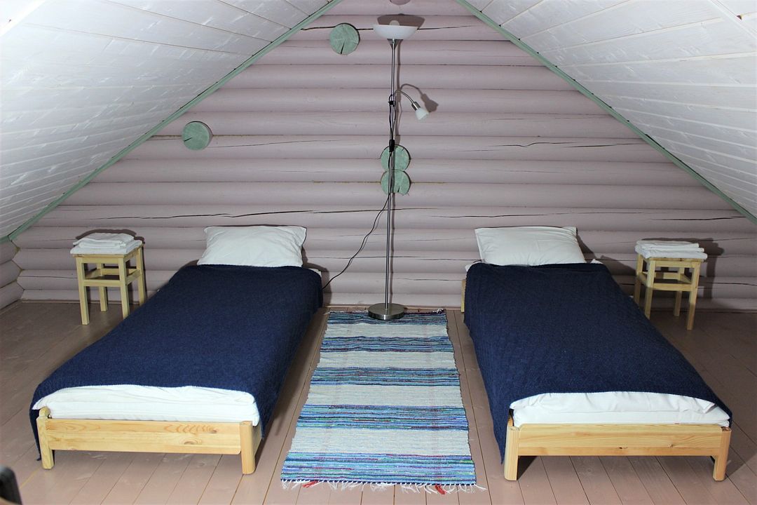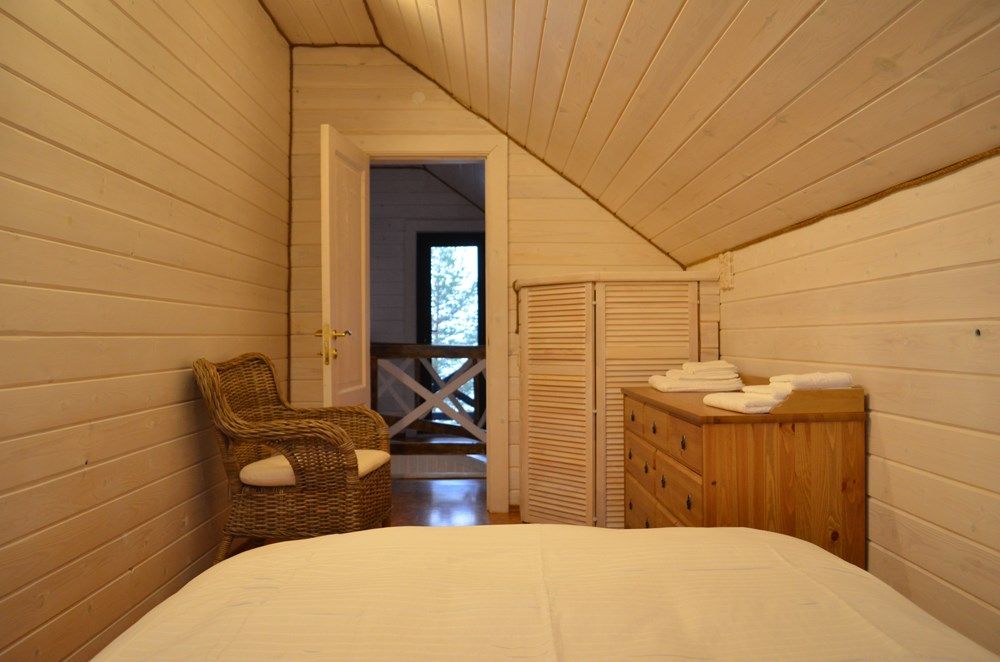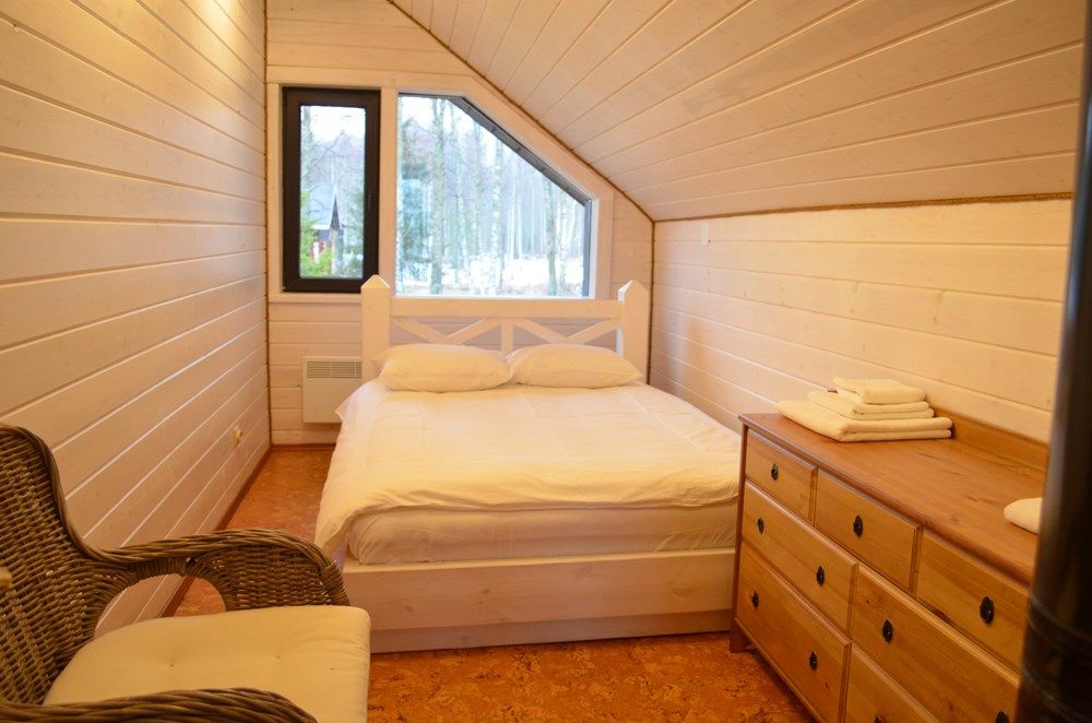 На первом этаже располагается кухня и гостиная-столовая, а также спальня с двуспальной кроватью. На втором этаже могут разместиться 3 человека на односпальных кроватях, либо пара на 1 двуспальной.