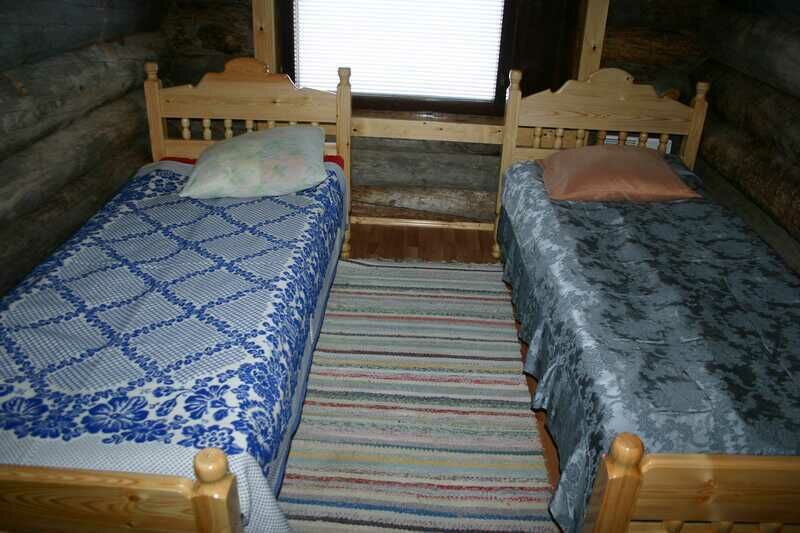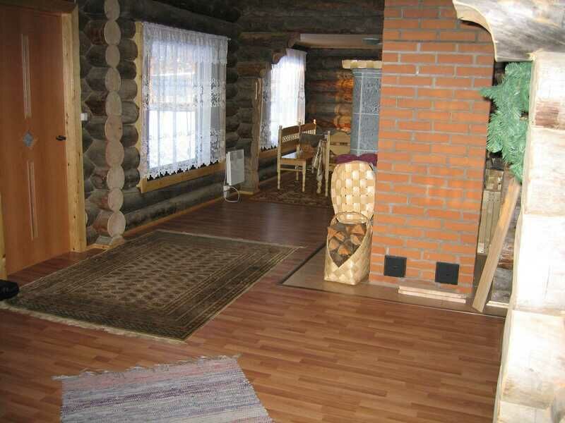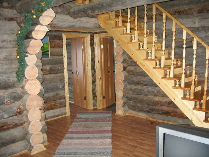 На первом этаже гостиная, пять спальных комнат (четыре двухместных и две одноместных), кухня, сауна, душевая кабина, два теплых туалета, бойлер с горячей водой (200 л). Комнаты, каждая площадью 9 кв.м. оборудованы деревянными односпальными кроватями. В гостиной (40 кв.м.): камин «Туликиви», большой обеденный стол, телевизор. В кухне: кухонный гарнитур, стол обеденный, электроплита, стиральная машинка, электрочайник, холодильник, микроволновая печь, посуда.