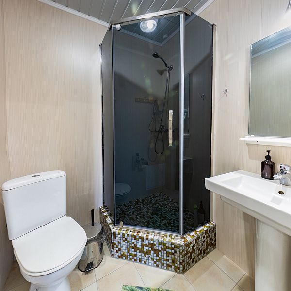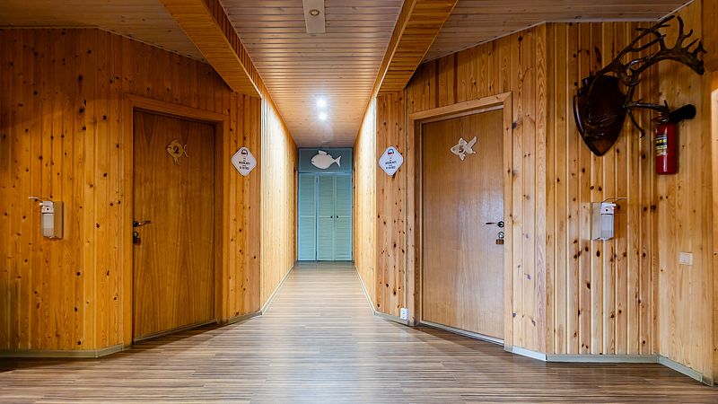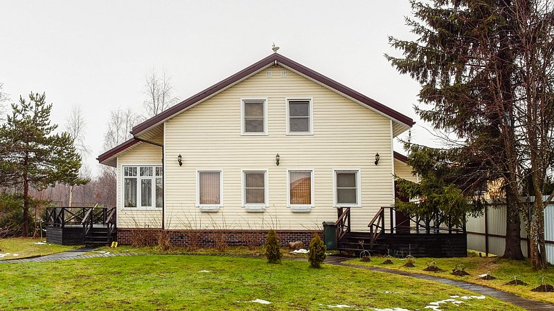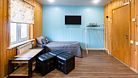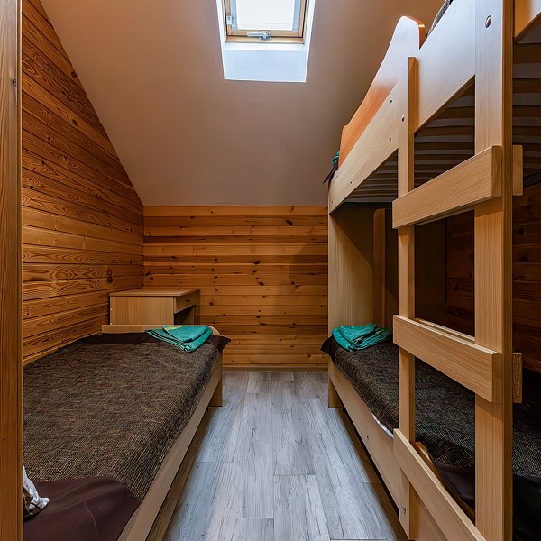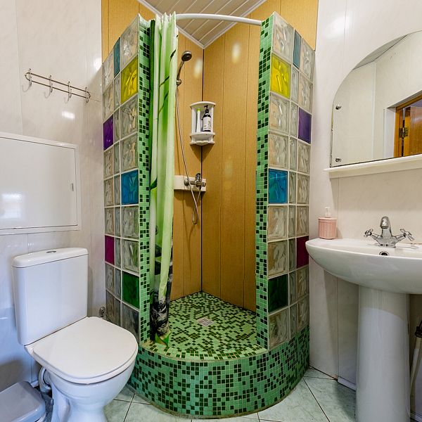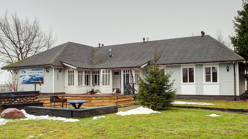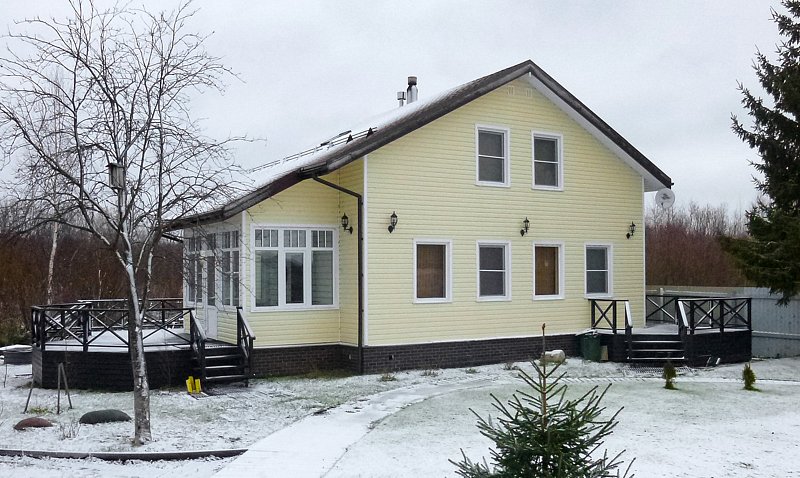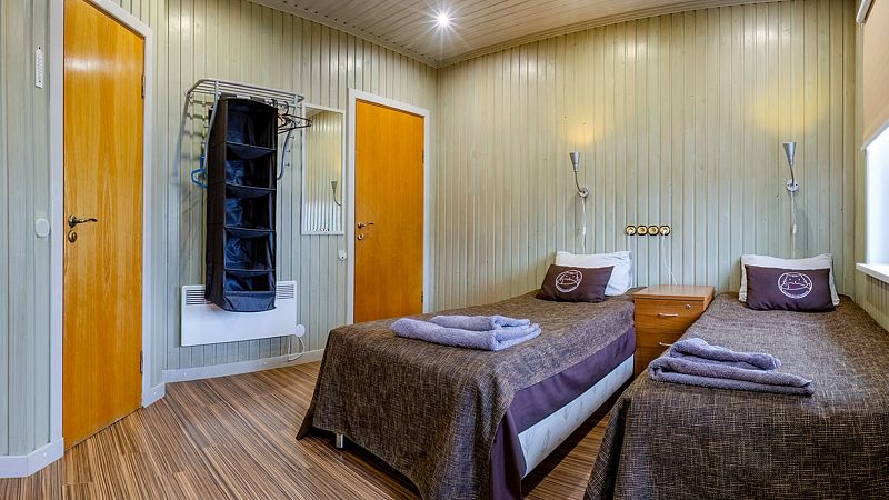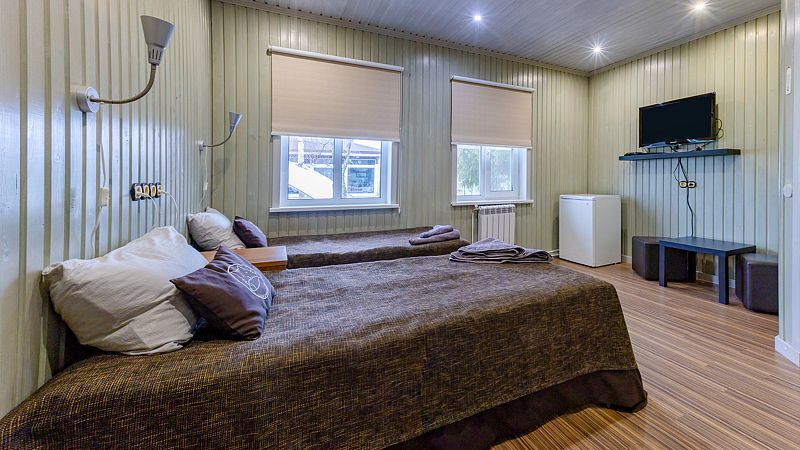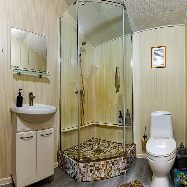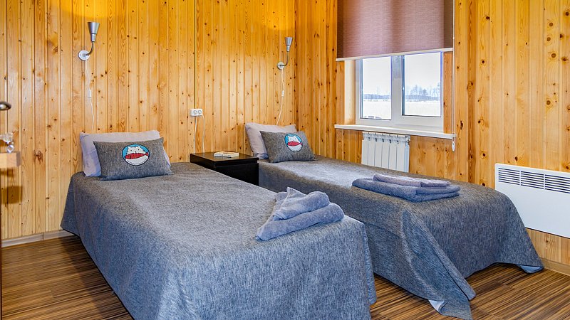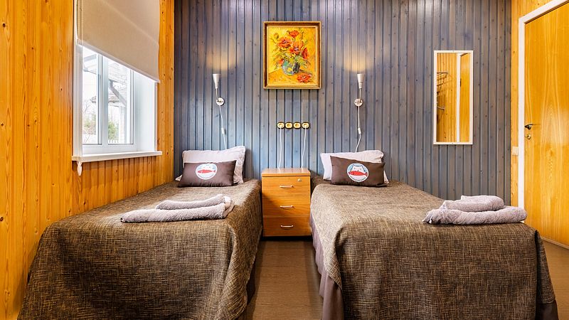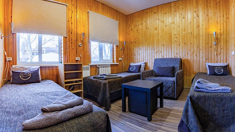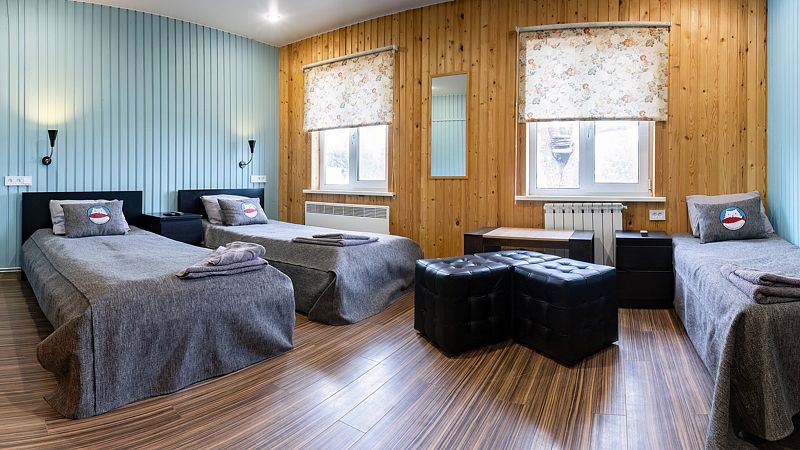 Двухэтажный коттедж. Первый этаж — баня. Второй этаж — жилое помещение из 3-х комнат. Вмещает 9 человек. По три в каждой комнате. У каждого этажа свой вход. Входы на этажи с разных сторон здания.