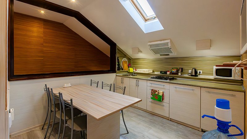 На втором этаже в распоряжении гостей полноценная кухня, где есть: