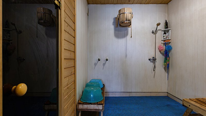 Инфраструктура: зона отдыха, обливное ведро, душВеликолепная русская баня. Парилка с огромной печью необычной конструкции, в которой, нагрев большой массы камней происходит непосредственно пламенем. Эта печь имеет минимальные теплопотери. Что позволяет очень долго держать в парилке оптимальную, именно для вас кондицию пара. При этом парилка достаточно большая — 5-6 человек размещаются комфортно.