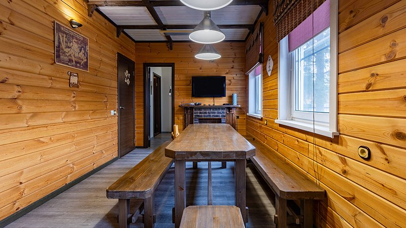 Всё остальное также на уровне. Прекрасная комната отдыха с обустроенной кухней и удобным столом для большой компании, отдельный санузел, раздевалка, телевизор и камин.