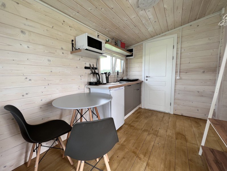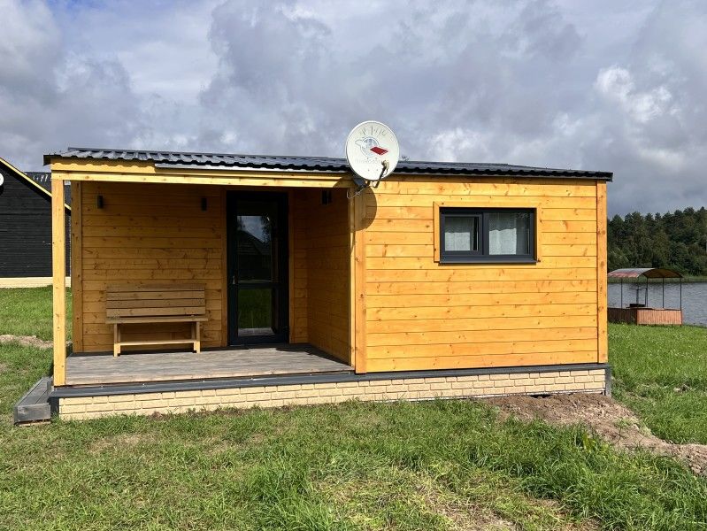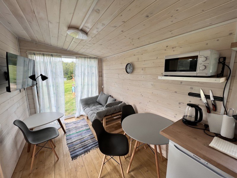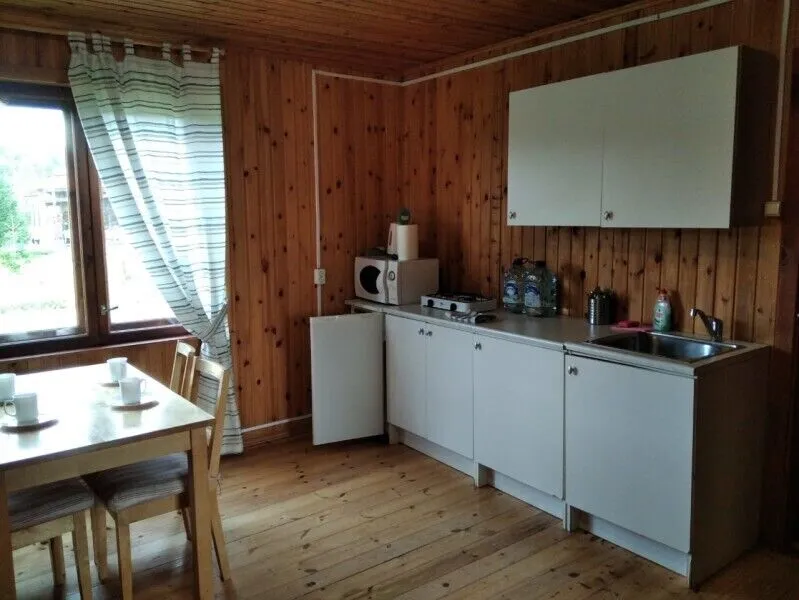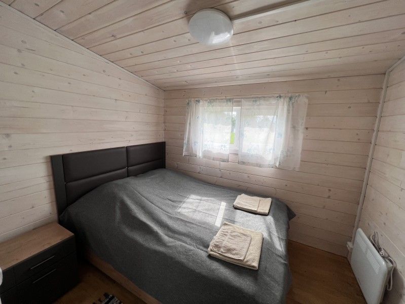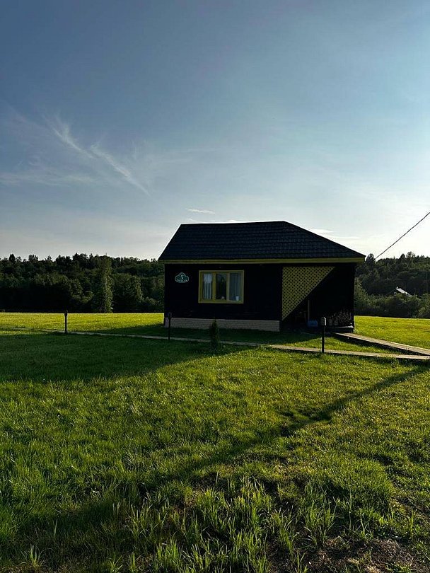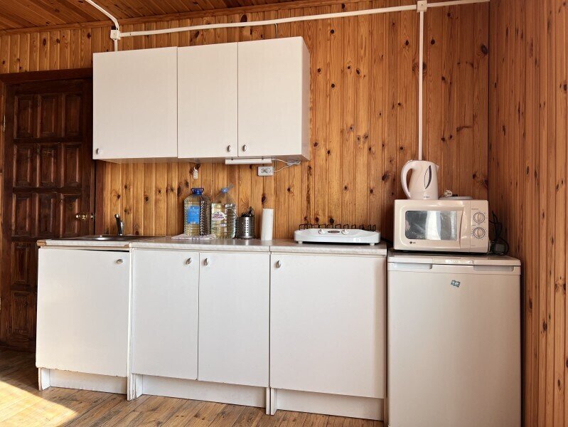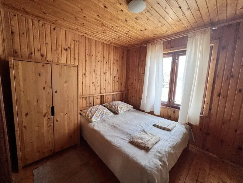 Уютный трехкомнатный коттедж для комфортного отдыха. Две спальные комнаты, в каждой по две односпальные кровати. Просторная гостиная с встроенной кухней, камином, телевизором. Кухня снабжена всем необходимым для удобного приготовления пищи. Санузел имеет душевую кабинку.