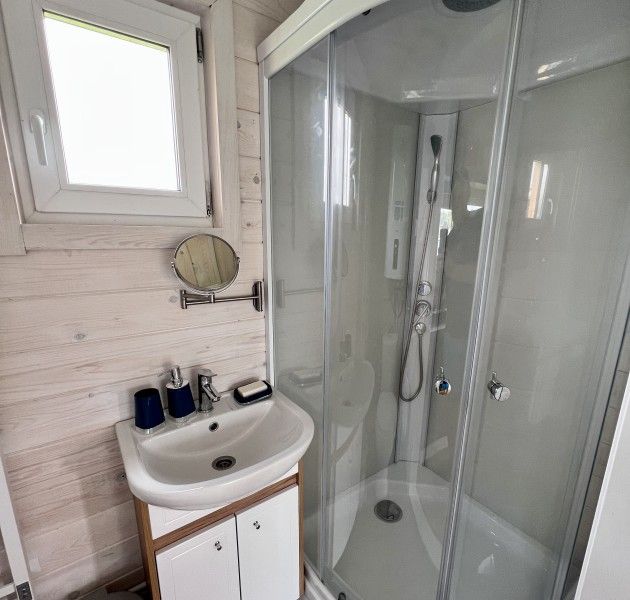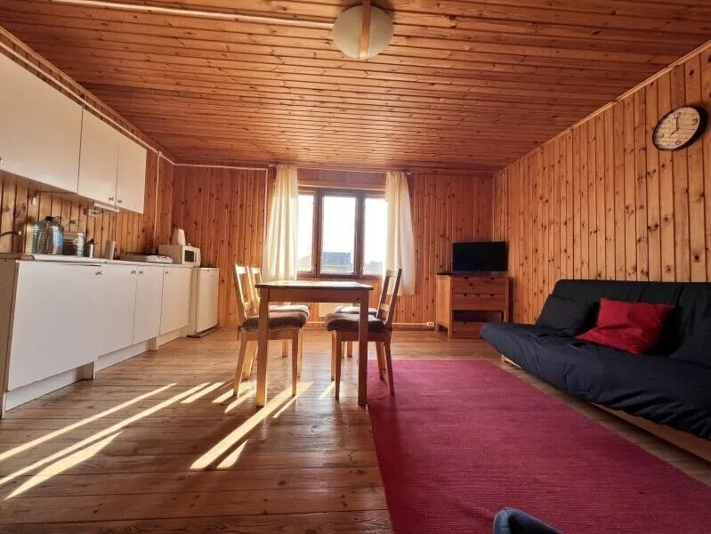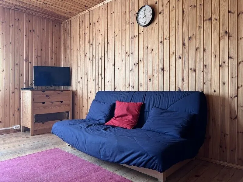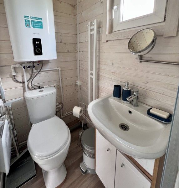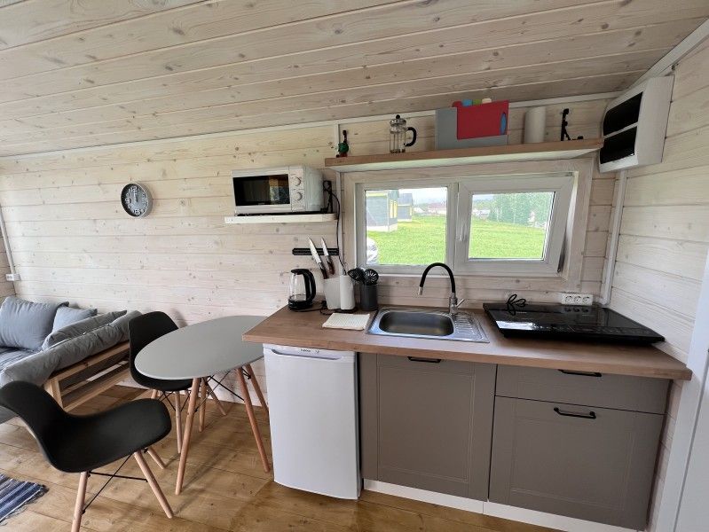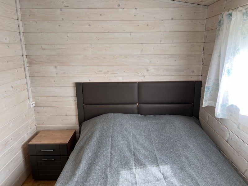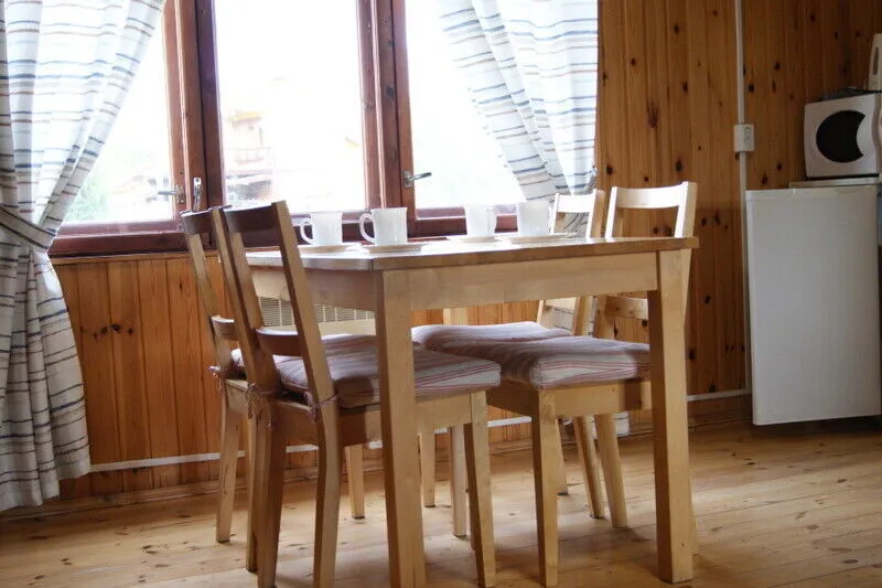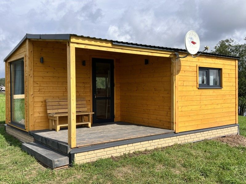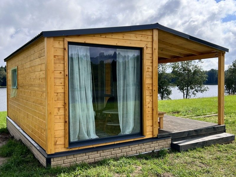 Уютный трехкомнатный коттедж для комфортного отдыха. Две спальные комнаты, в каждой по две односпальные кровати. Просторная гостиная с встроенной кухней, камином, телевизором. Кухня снабжена всем необходимым для удобного приготовления пищи. Санузел имеет душевую кабинку.