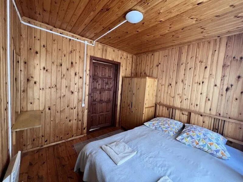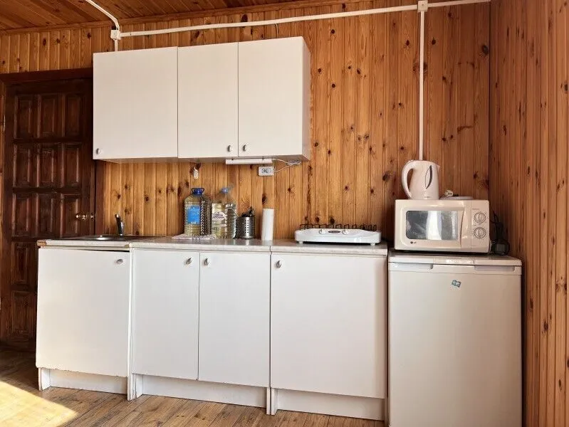 Уютный трехкомнатный коттедж для комфортного отдыха. Две спальные комнаты, в одной двуспальная кровать, в другой две односпальные. Просторная гостиная с встроенной кухней, камином, телевизором. Кухня снабжена всем необходимым для удобного приготовления пищи. Санузел имеет душевую кабинку.