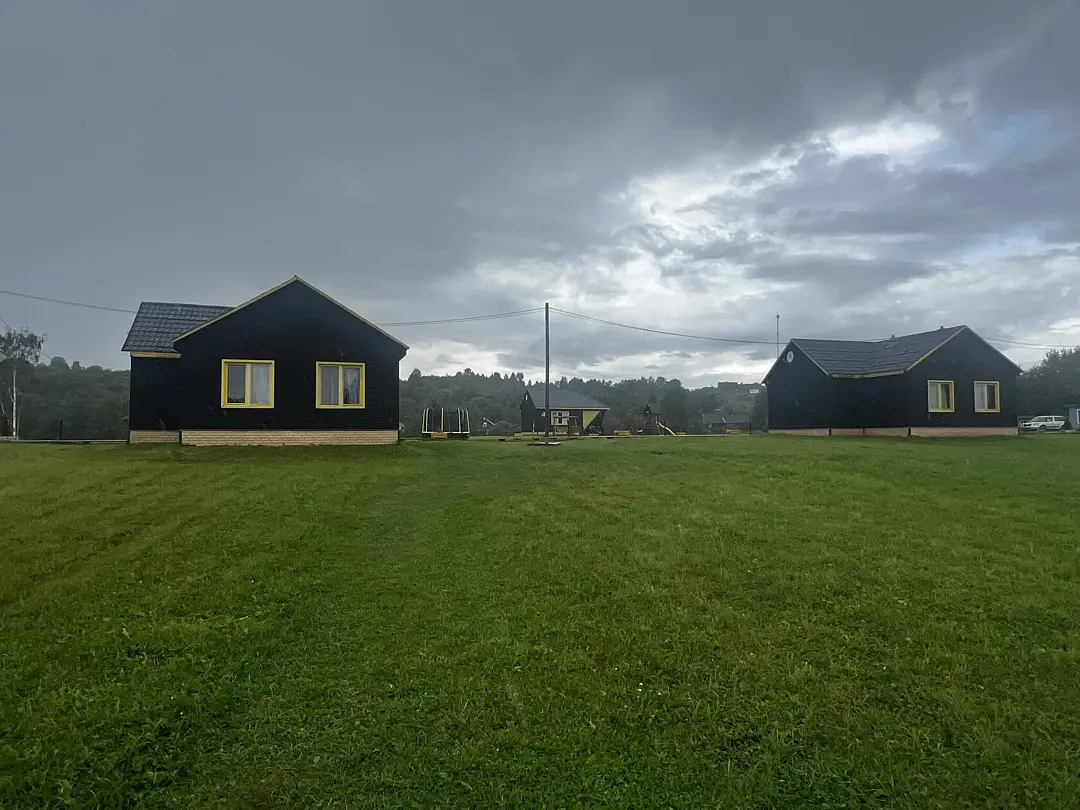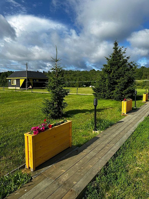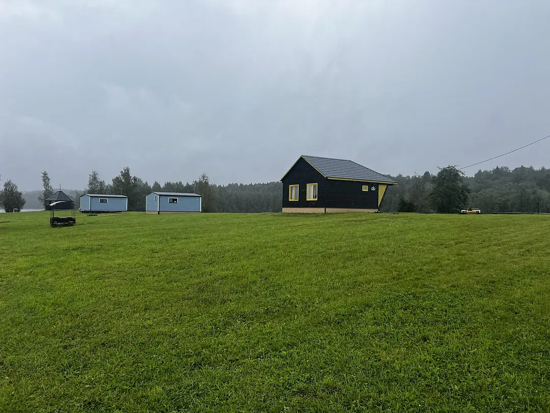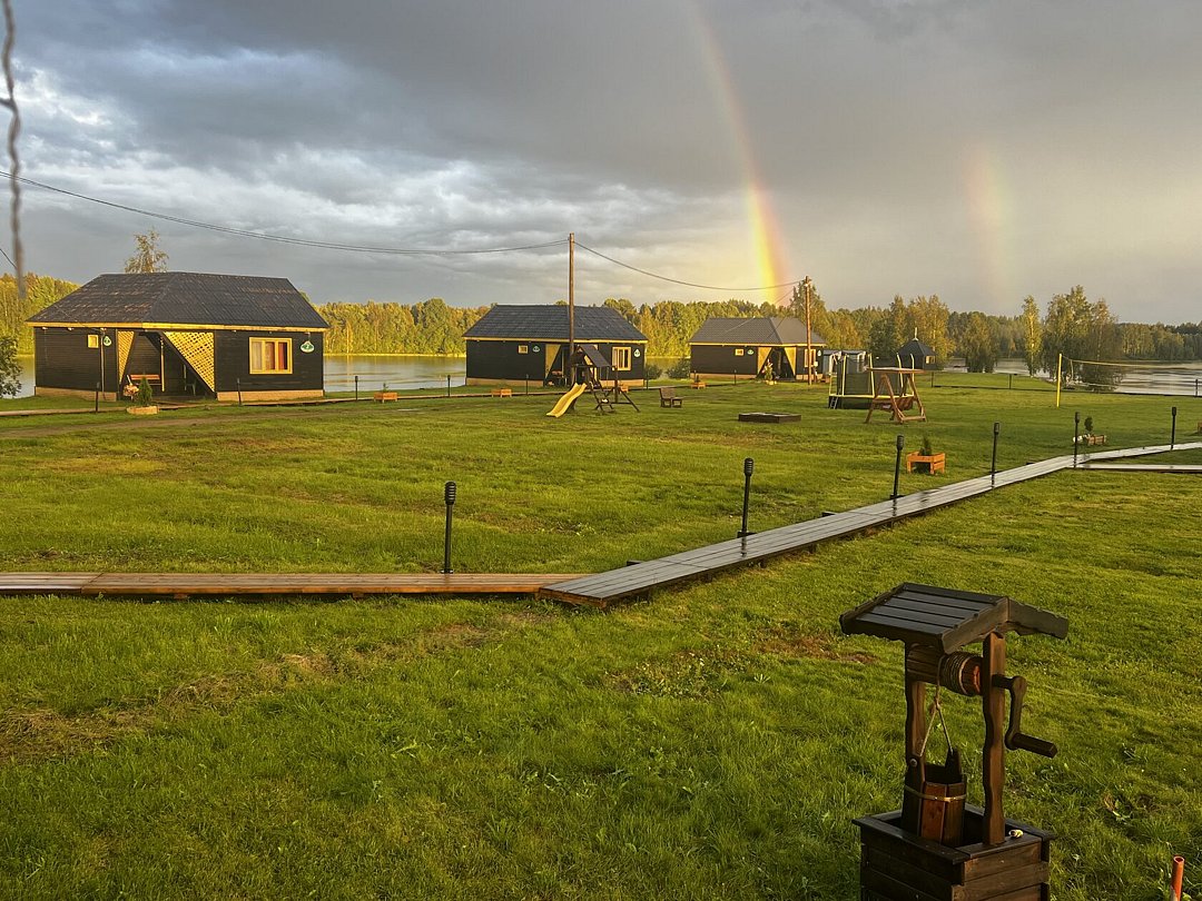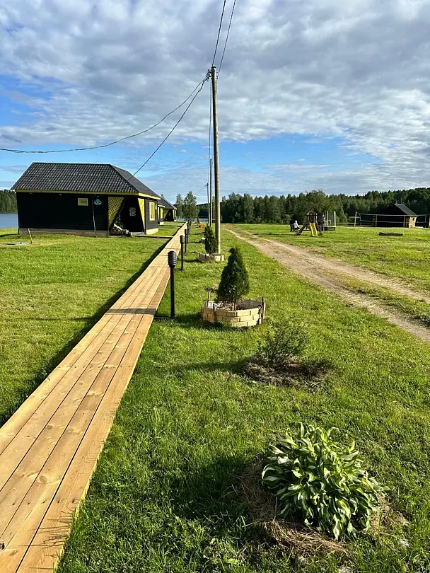 На базе пять уютных коттеджей, административное здание, кафе, большая застекленная гриль-беседка с очагом, баня, парковка, лодочный причал и прокат спортивного инвентаря. В каждом коттедже просторный холл с камином и оснащенной кухней, две спальни и санузел с горячей водой.