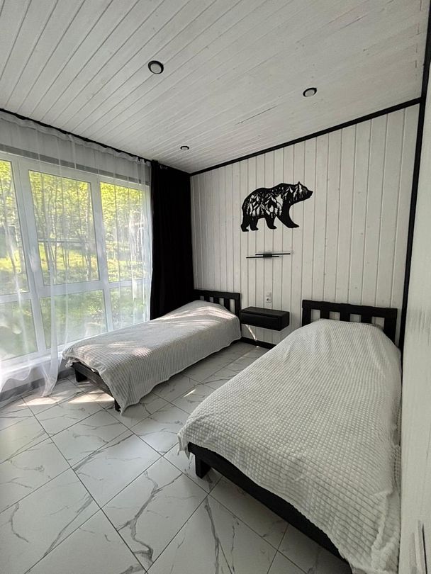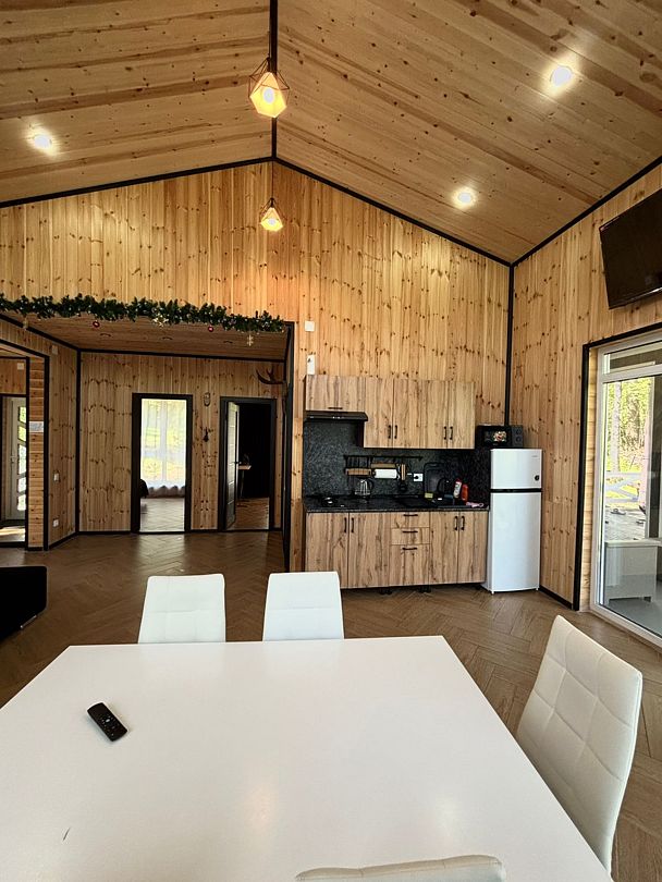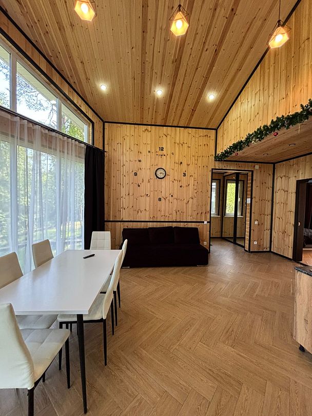 Семейный отдыхДостоинстваУютные домики в лесу, недалеко есть озеро в котором можно половить рыбу. Ремонт новый, все выглядит аккуратно и уютно, удобно что в одной комнате двухспальная кровать, а в другой - две односпальные, в доме есть сауна, а на улице чан. Отдых удался