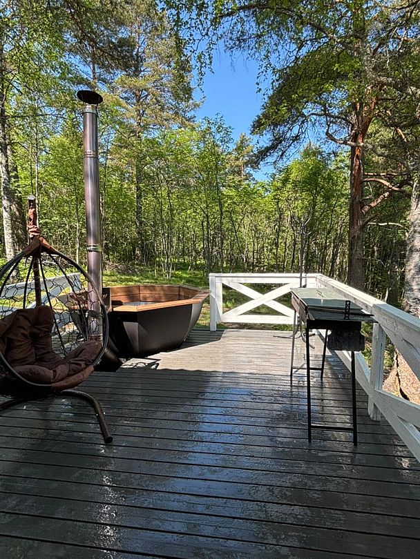 Семейный отдыхДостоинстваВ ДарЭли мы нашли всё,что хотели, и даже больше: расположение в тени леса,но и солнца предостаточно, уютный дом с красивым современным интерьером, удобными матрасами и шторами блэкаут, возможность готовить самостоятельно на газу ( все принадлежности есть) или мангале, отличная проточная вода, сауна, чан, душ с горячей водой, возможность рыбачить и купаться ( до залива метров 200). Нас встретили гостеприимные и дружелюбные хозяева. Но то, что тронуло моё сердце особенно- это возможность отдохнуть во всей этой красоте и комфорте с нашей любимицей Эммой. Спасибо, дорогие хозяева, ещё раз!