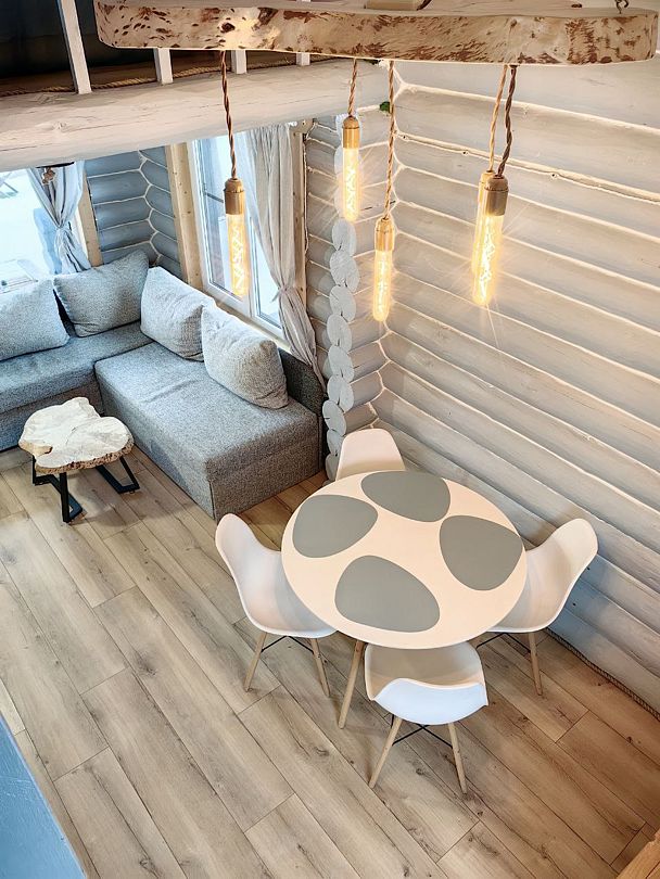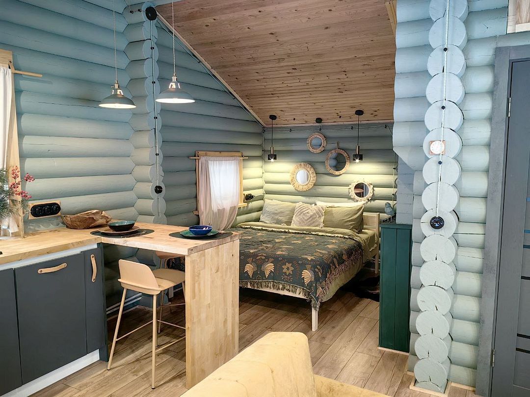 Дом сделан из бруса, с использованием природных материалов во внутренней отделке. Деревянные элементы обработаны безопасными маслами и красками. В окружении воды и сосен гарантирован здоровый сон.