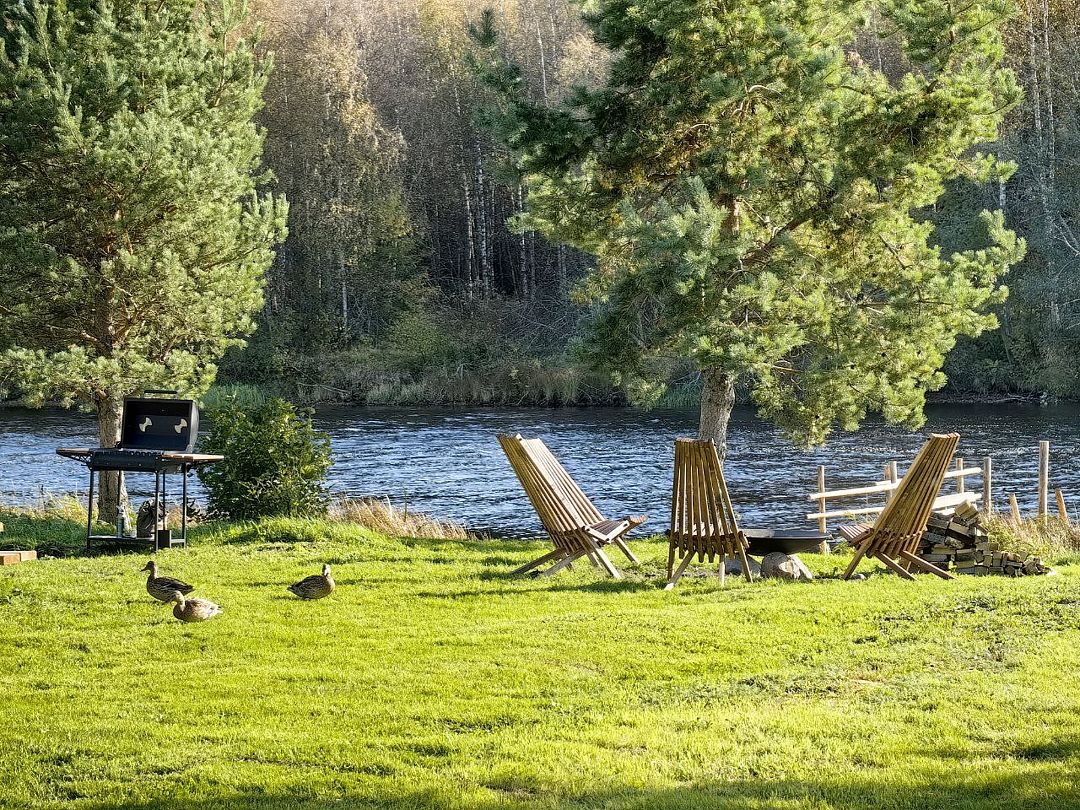 На участке — терраса, гриль, спуск в реку. Костровая чаша на камнях и кресла Кентукки позволят провести вечер у костра, дрова без ограничений. Предусмотрен отдельный вход в душевую комнату прямо с террасы.