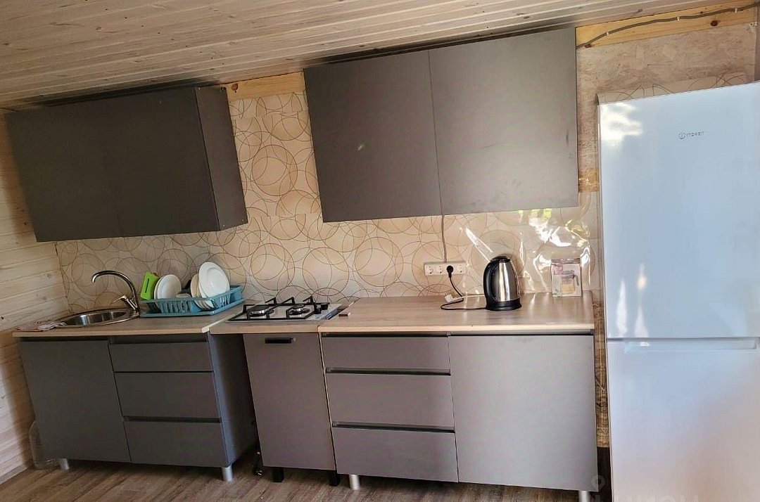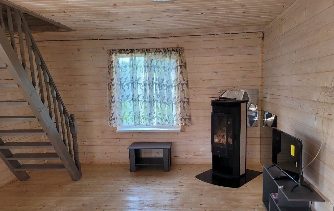 Для проживания здесь предусмотрено всё необходимое. На первом этаже дома есть оборудованная кухня, диван и камин, на втором этаже — уютная светлая спальня. Есть санузел с туалетом и душевой кабинке, бойлер, горячая и холодная вода.