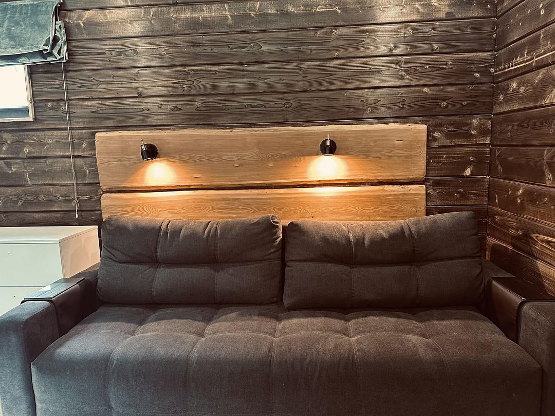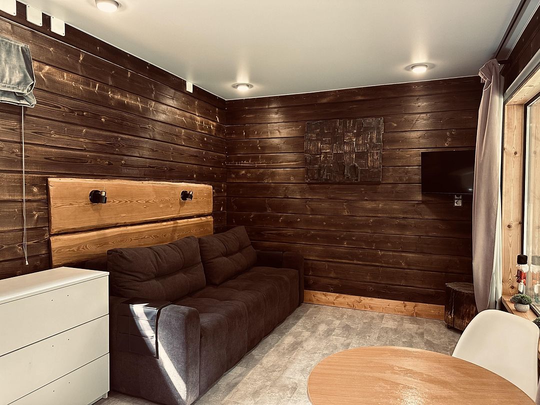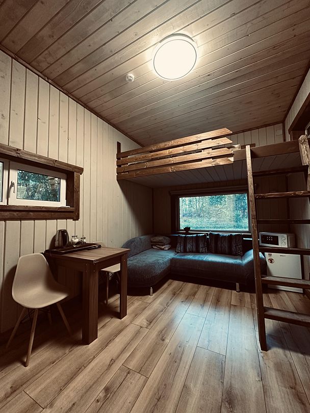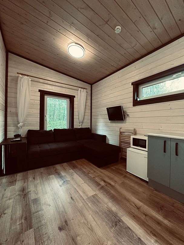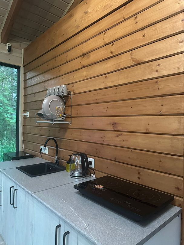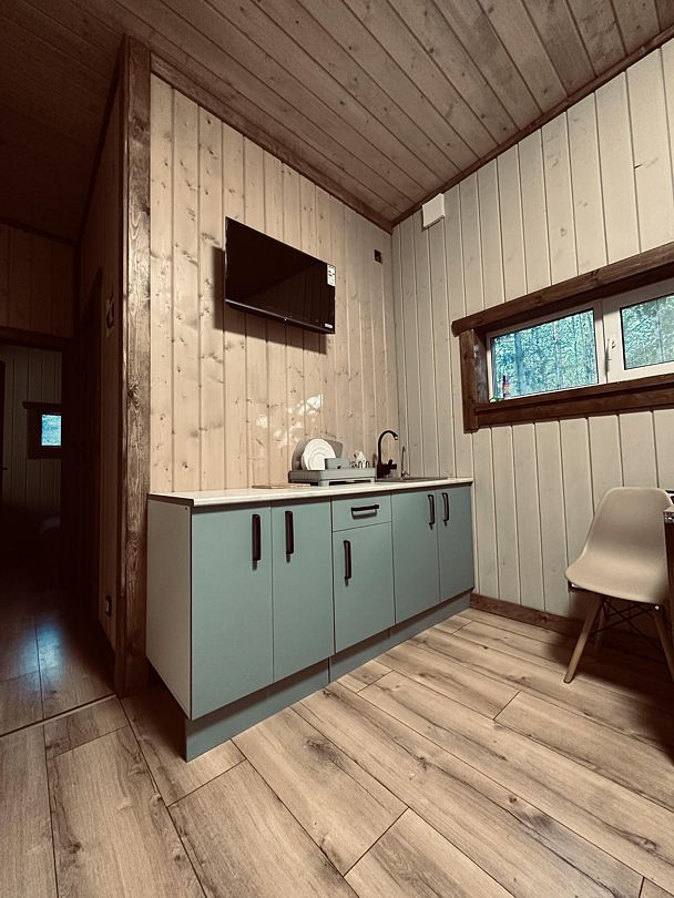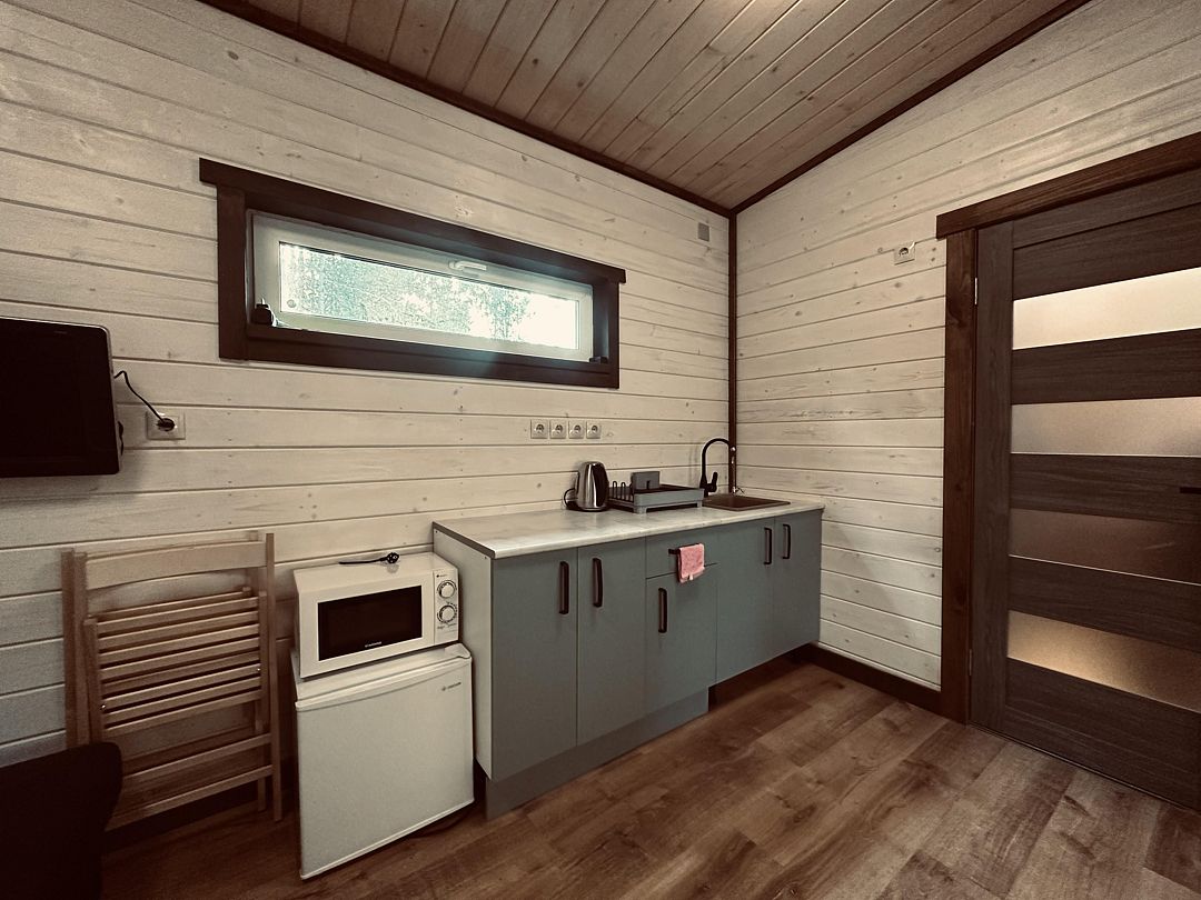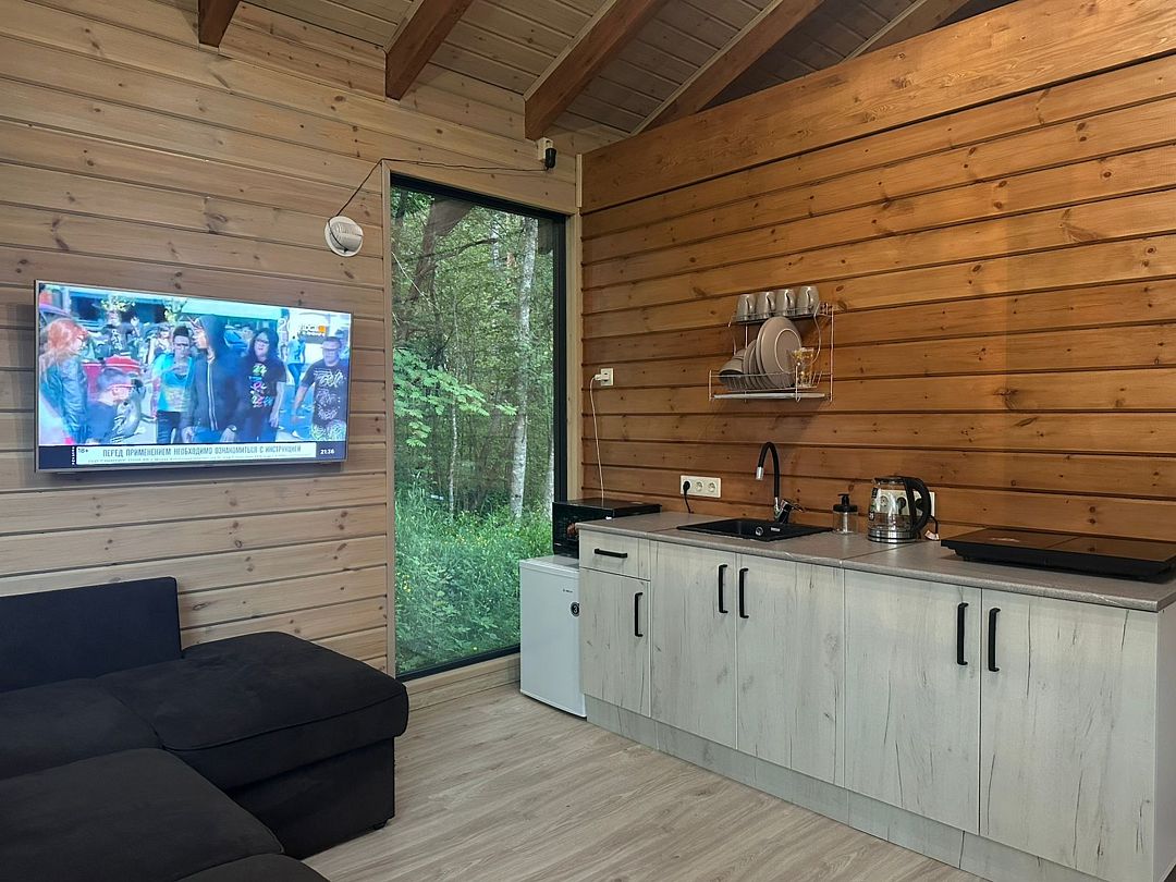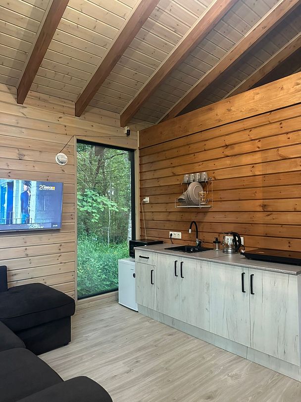 Кухня-гостиная с раскладным диваном, а также лофт-этажом со спальным местом 140х200. Кухня оснащена холодильником, микроволновой печью, индукционной плитой на 2 конфорки, чайником.