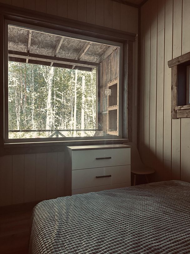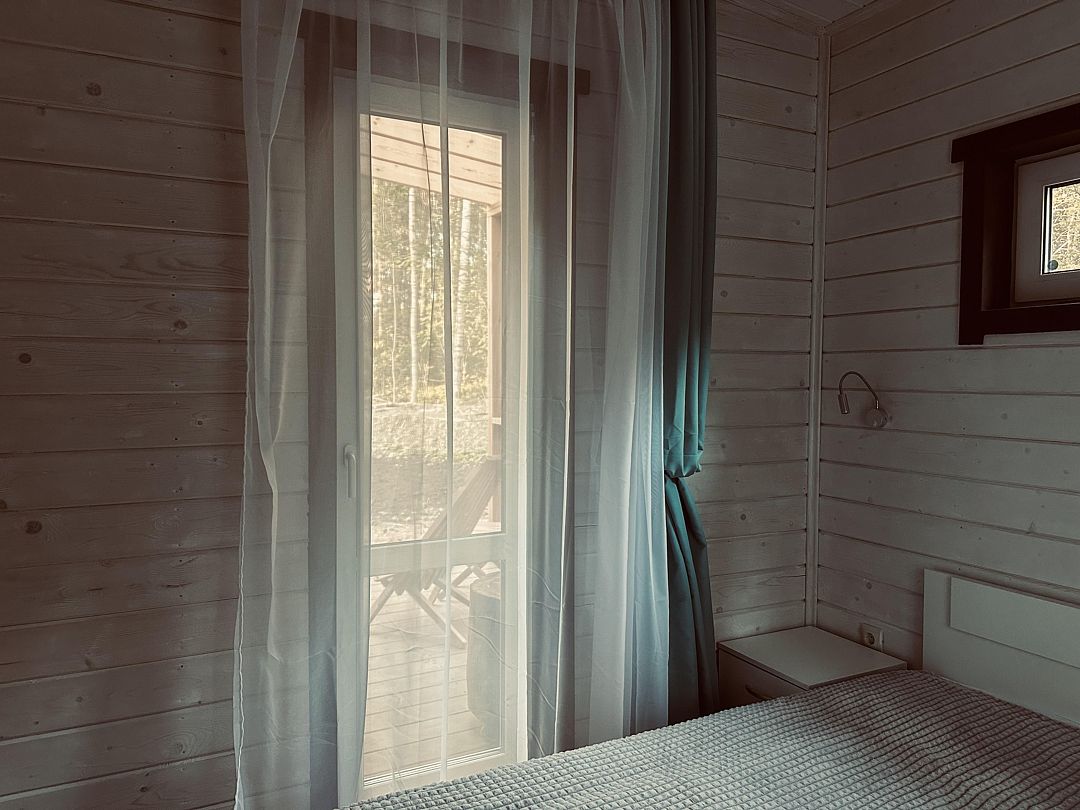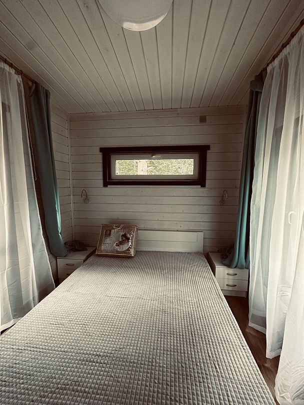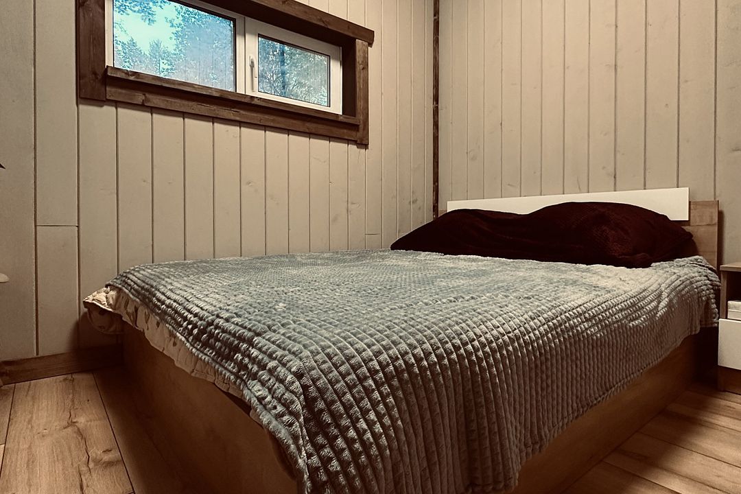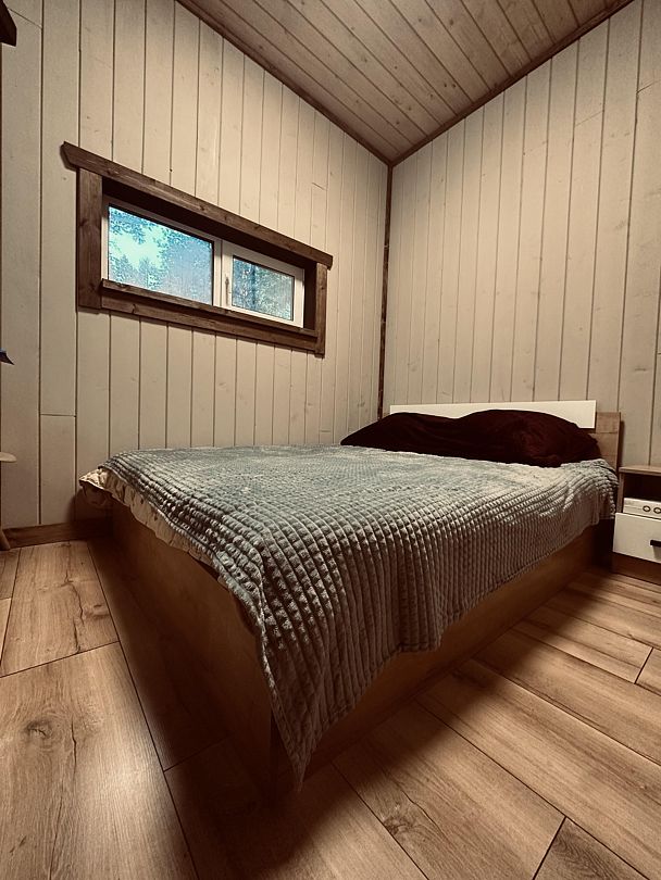 Уютный дом вместимостью до 6 человек. К Вашим услугам rрытая терраса 12 м² с уличной мебелью. Спальня с большой двуспальной кроватью 160х200 и панорамным окном с видом на Карельский лес, комод.