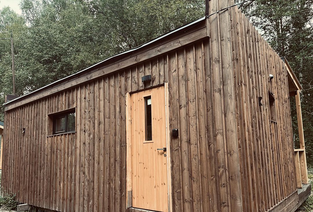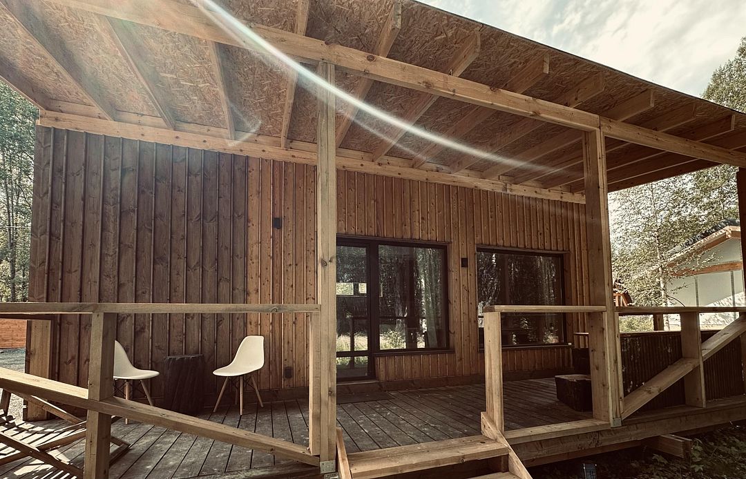 Двухместный дом с панорамными окнами и крытой террасой 18 м², полноценная кухня, душевая.