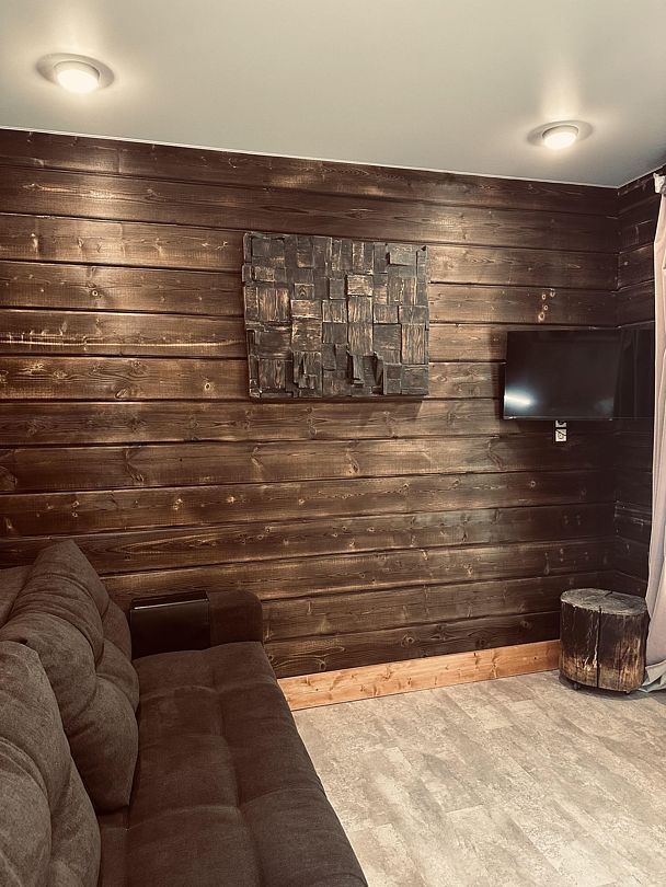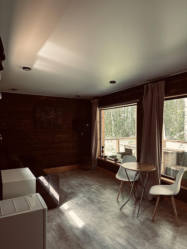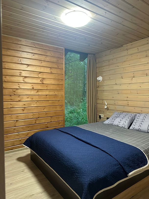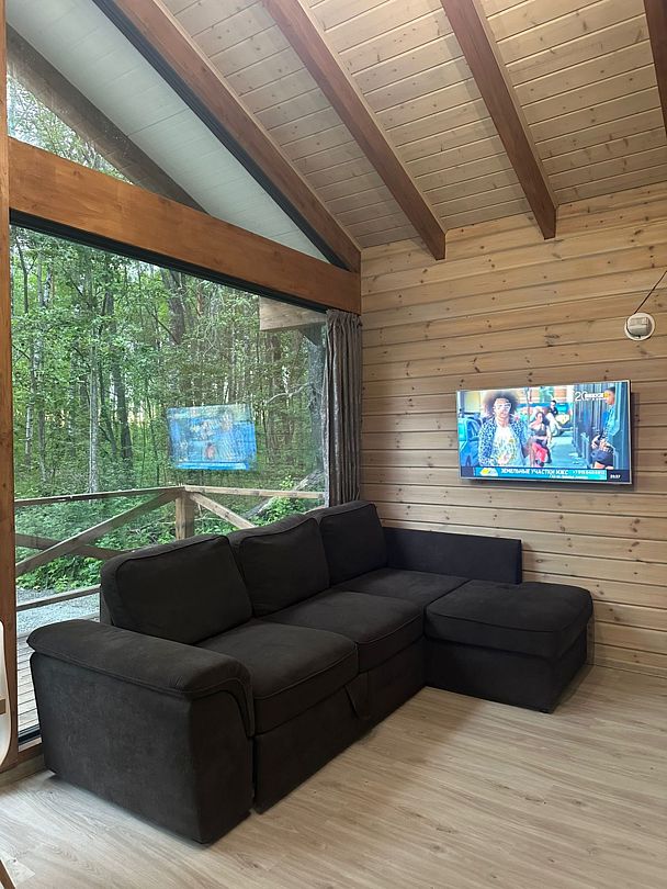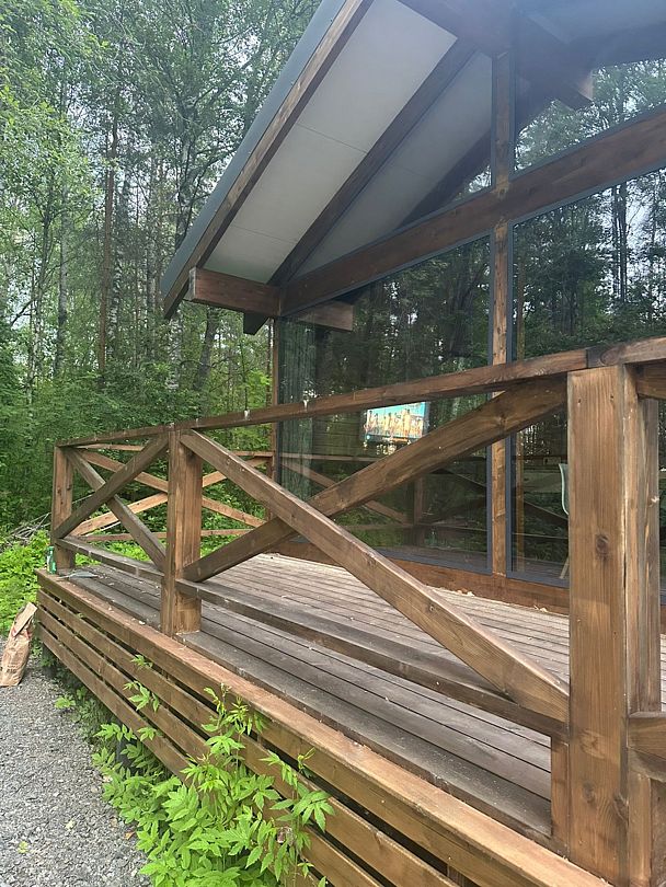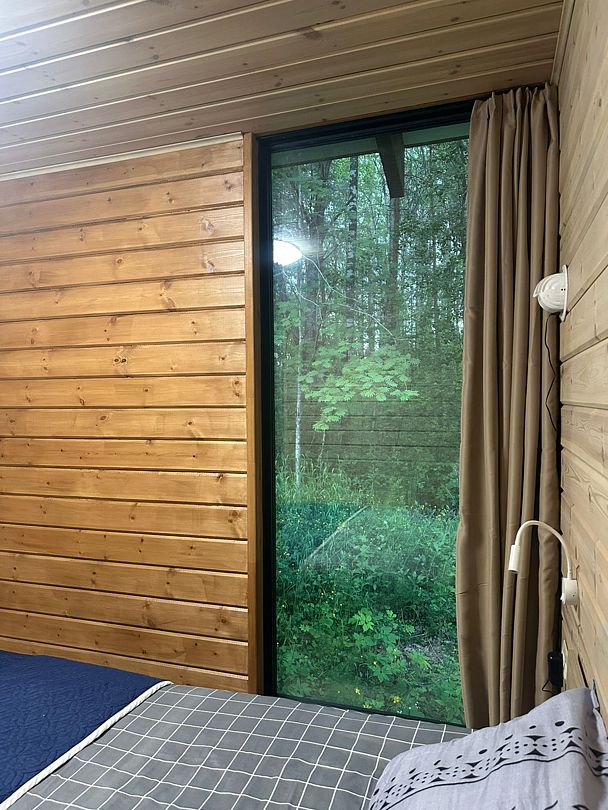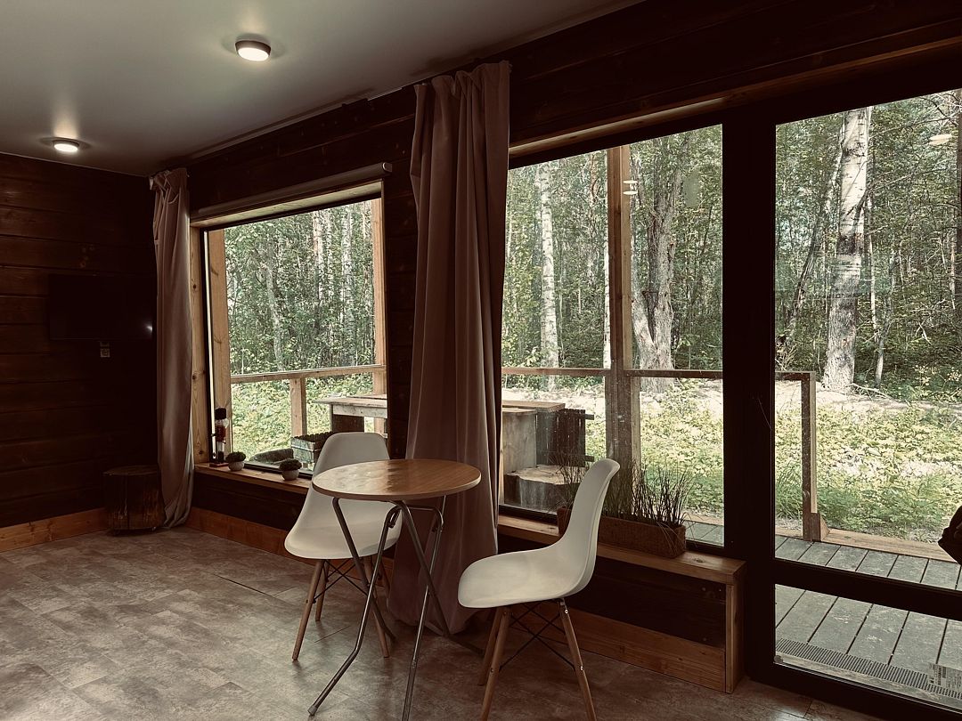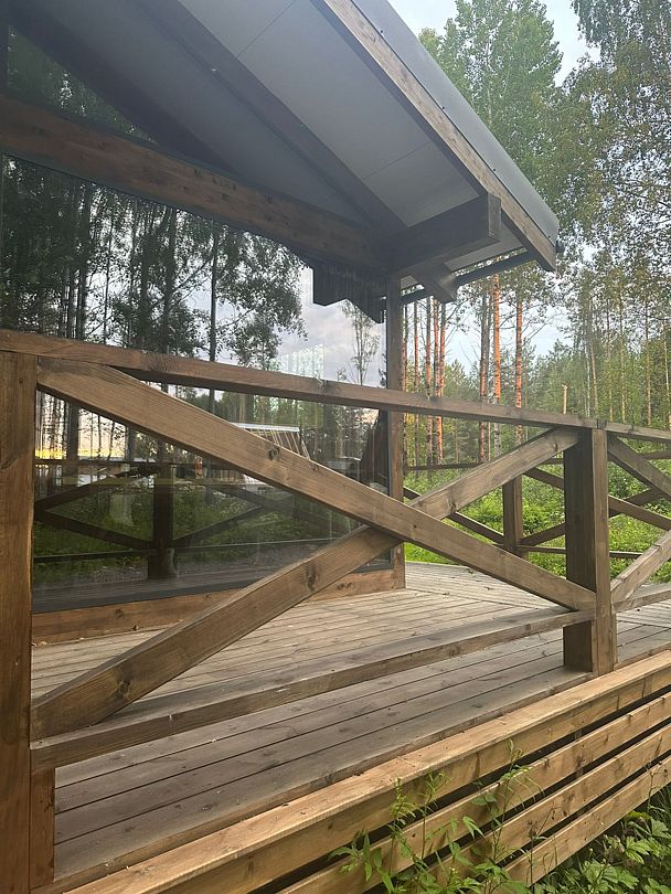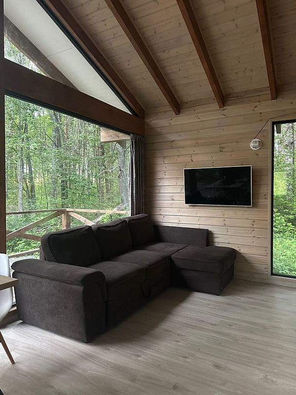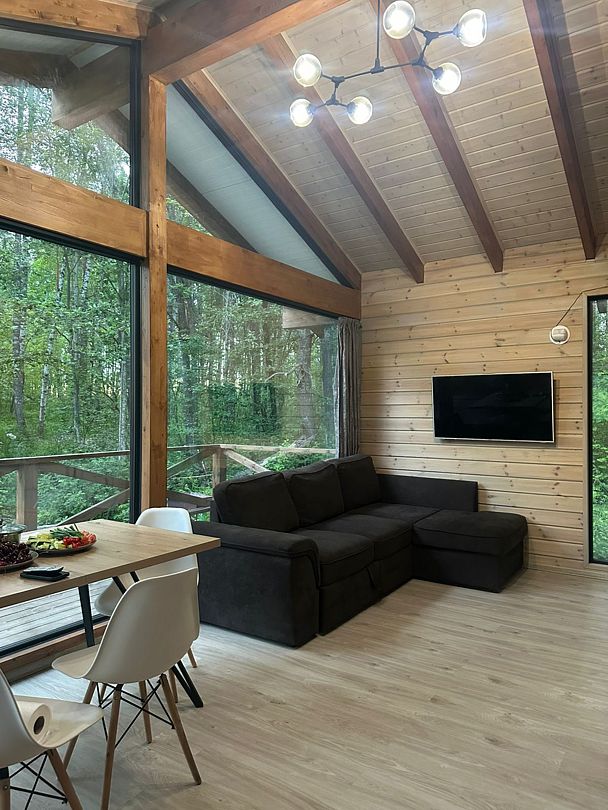 Дом выполнен из экологически чистого карельского материала, вся отделка из природных материалов. В доме дышится гораздо легче, а шум леса и пение птиц помогает восстановиться после городской суеты. Хоть и находится в лесу, здесь прекрасно ловит LTE. Уютный дом с панорамными окнами на всю стену с видом на лес и окнами в пол, вместимостью до четырех взрослых человек