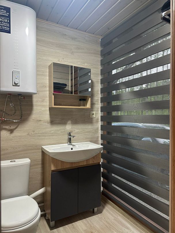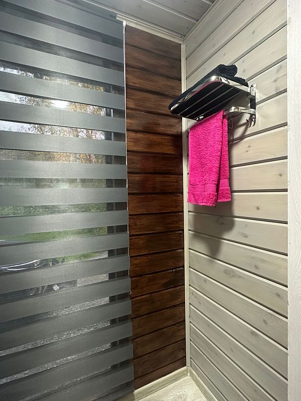 К вашим услугам в доме: крытая терраса 7 м² с прозрачной крышей с выходом из спальни и из дома. Спальня с большой кроватью 160х200, большими окнами и комодом. Гостиная-кухня с раскладным диваном (дополнительные спальные места) и телевизором (смарт-тв).