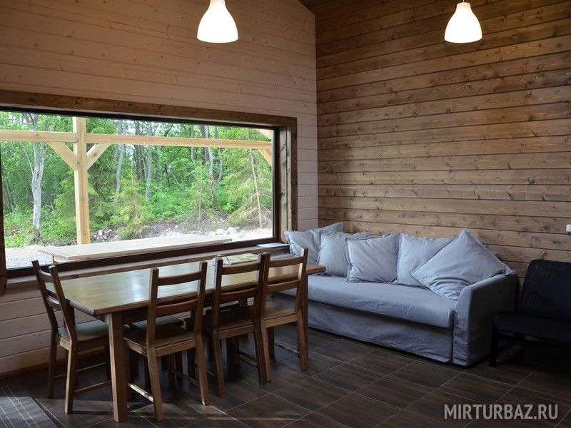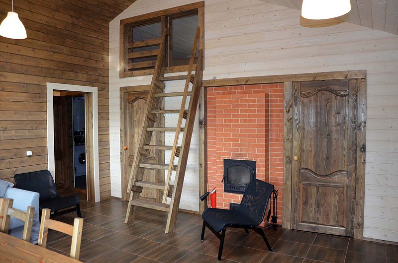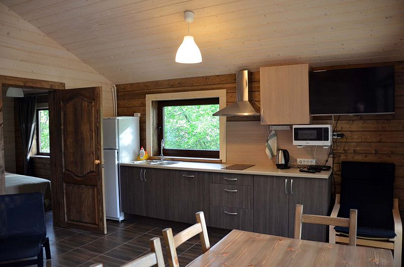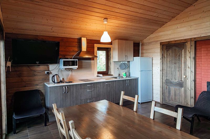 В домике: удобная мебель, дровяная печь, духовка, камин, лежанка на печи, полный набор посуды, холодильник, электроплита, посудомоечная машина, туалет, беседка, мангал, сауна.