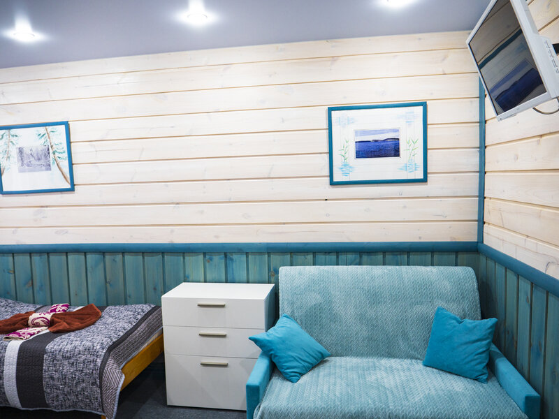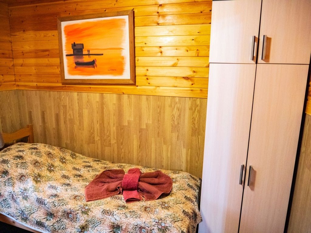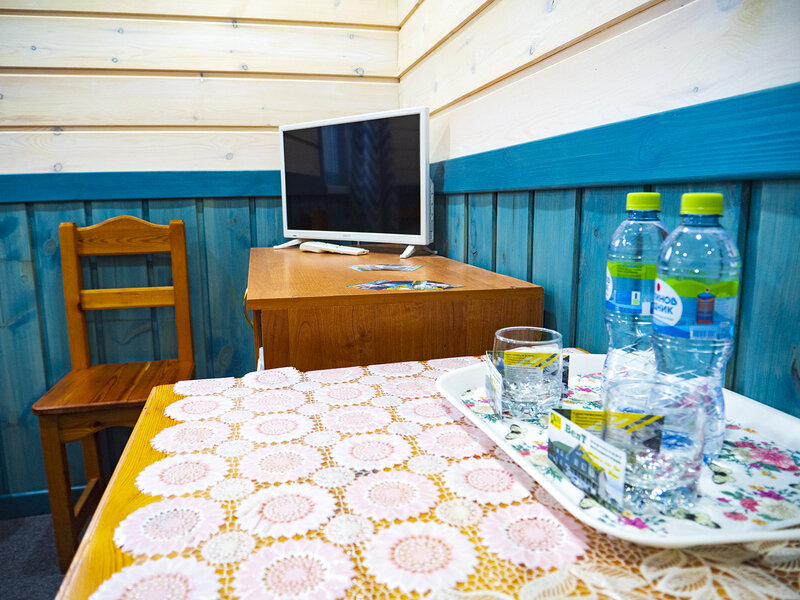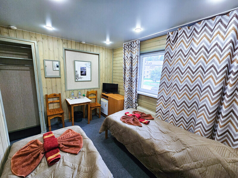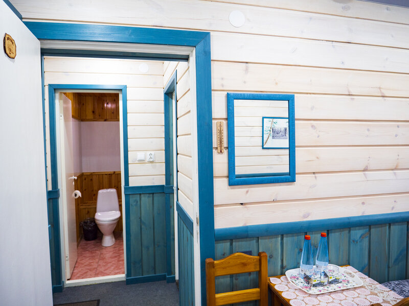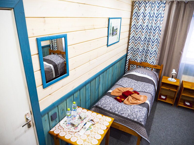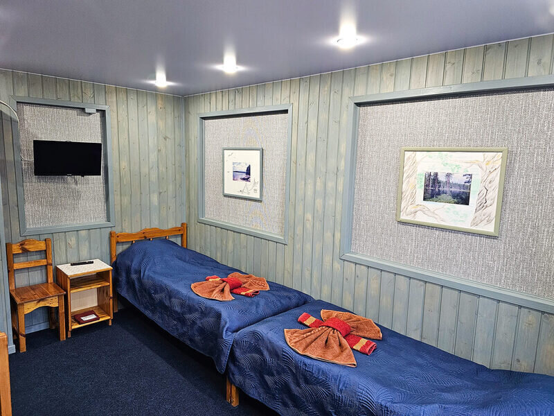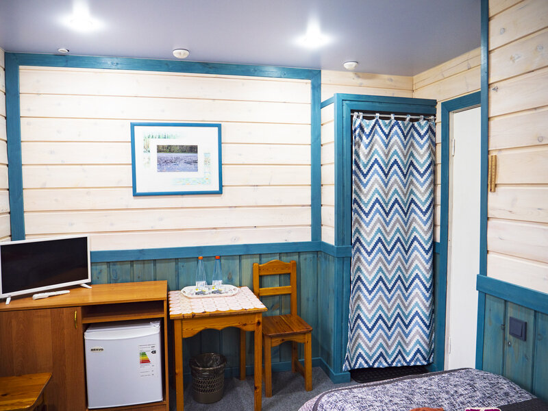 В номере: спальная мебель из массива карельской сосны (ручная работа), прикроватные тумбочки, вешалка для одежды, стол и стулья, ТВ, Wi-Fi, зеркало, графин, стаканы, покрытие пола ковролин. В летнее время выдается фумигатор.